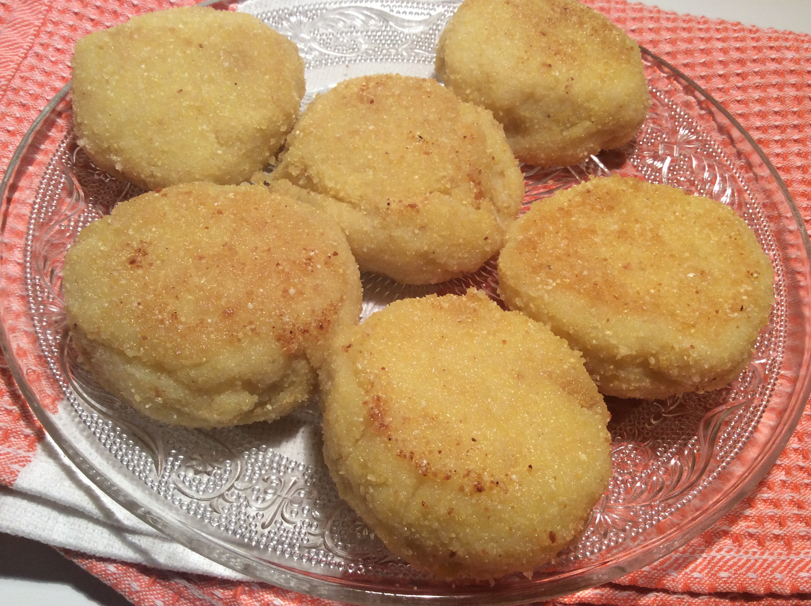4. A la main, façonner des galettes que l’on passe ensuite dans la chapelure et que l’on dépose sur une assiette huilée. A ce stade, les galettes peuvent patienter dans le frigo (couvertes de film étirable) jusqu’au repas.