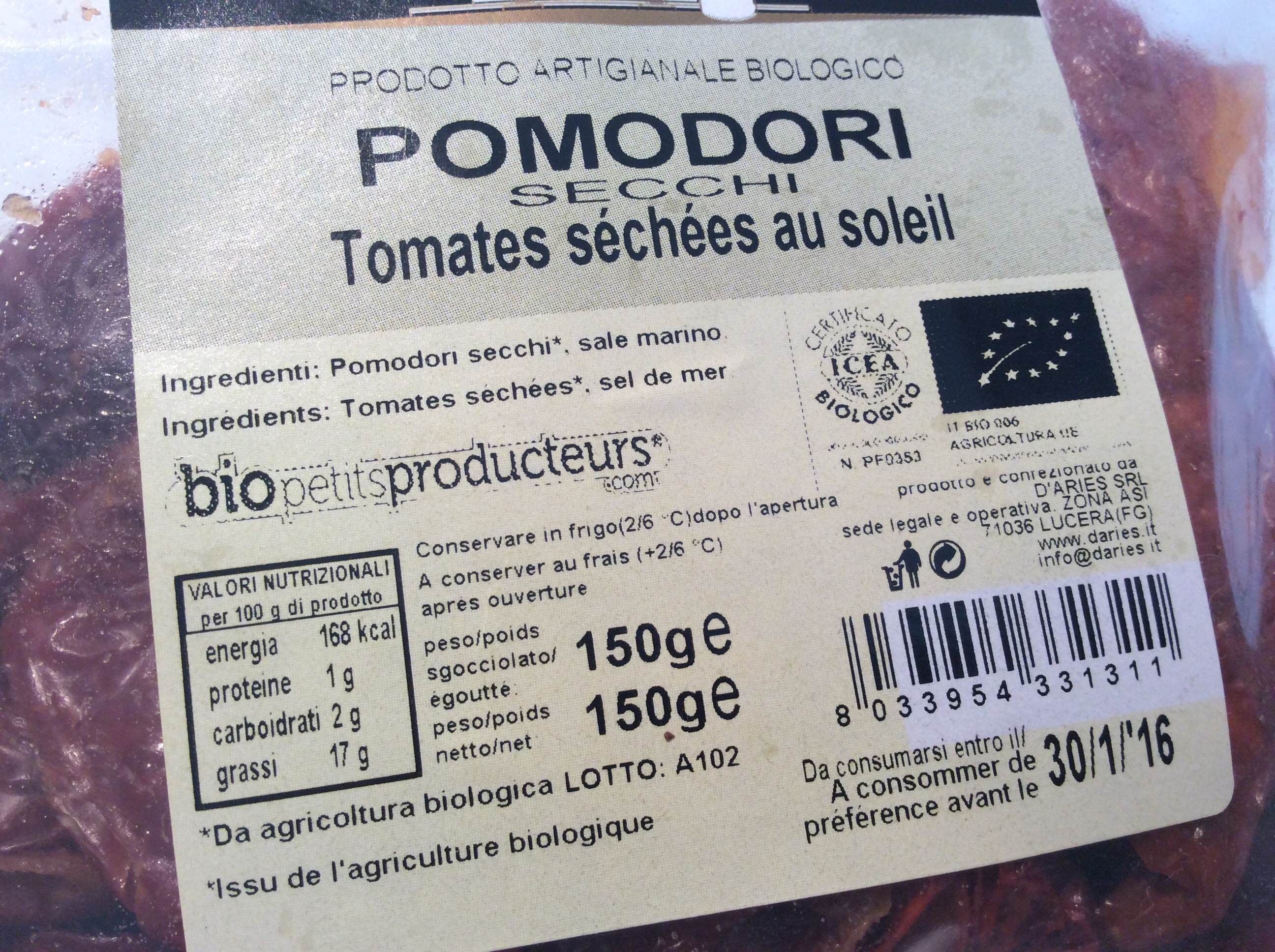 Attention: selon la marque de tomates séchées, il se peut que vous soyez obligés de les réhydrater rapidement avec un peu d’eau tiède (que l’on jète ensuite). En disant cela, je pense à des tomates achetées sur le continent nord-américain et que j’ai trouvées particulièrement sèches.