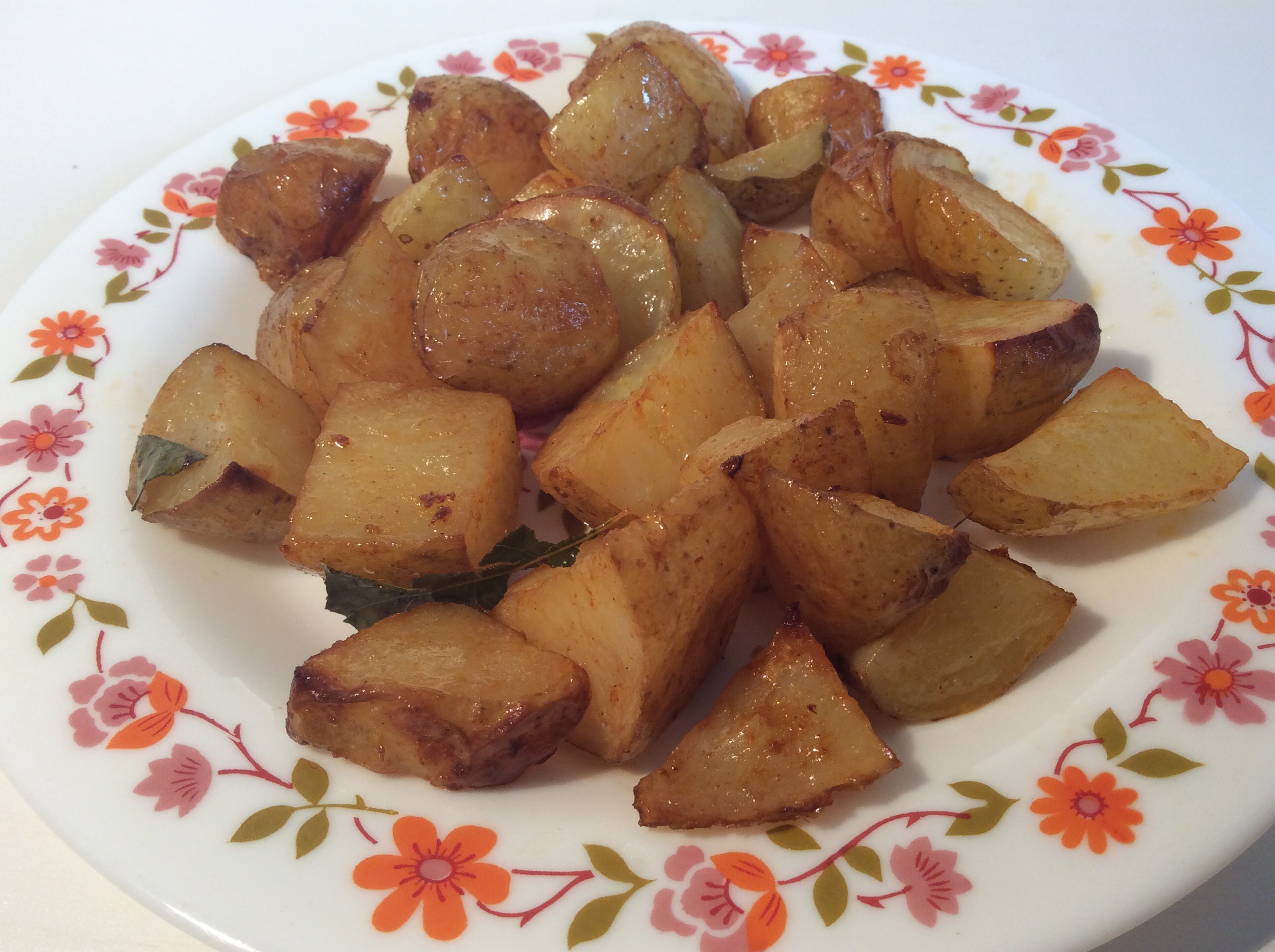 2. Les mettre dans un plat allant au four, les saupoudrer légèrement de paprika doux (facultatif, je le fais pour leur donner de la couleur), saler de préférence avec du gros sel non raffiné (sinon avec du sel fin, lui aussi naturel et sans ajout aucun), puis arroser généreusement d’huile d’olive. Ajouter une ou deux feuilles de laurier froissées (pour en libérer l’arôme). Bien mélanger le tout pour que les pommes de terre soient bien enrobées.