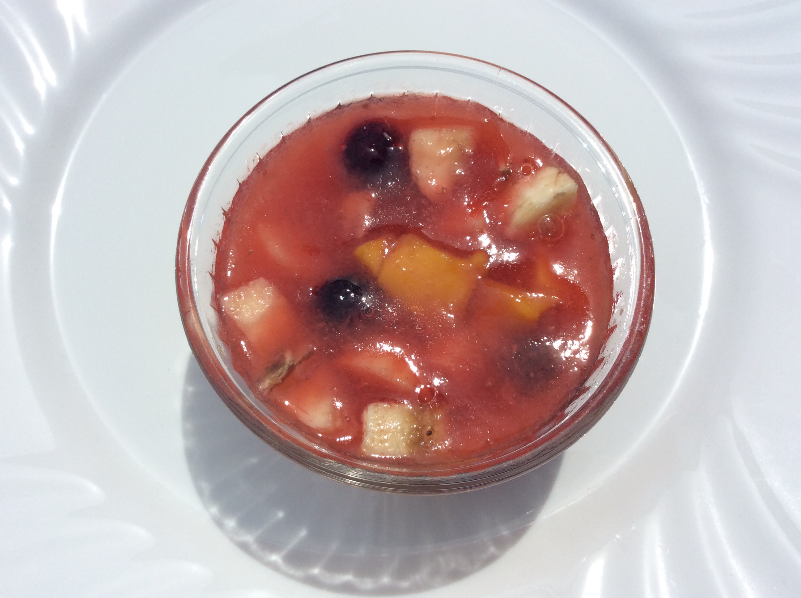 4. Verser sur les fruits et mettre à prendre au réfrigérateur quelques heures. Chez moi trois à quatre heures ont suffi.