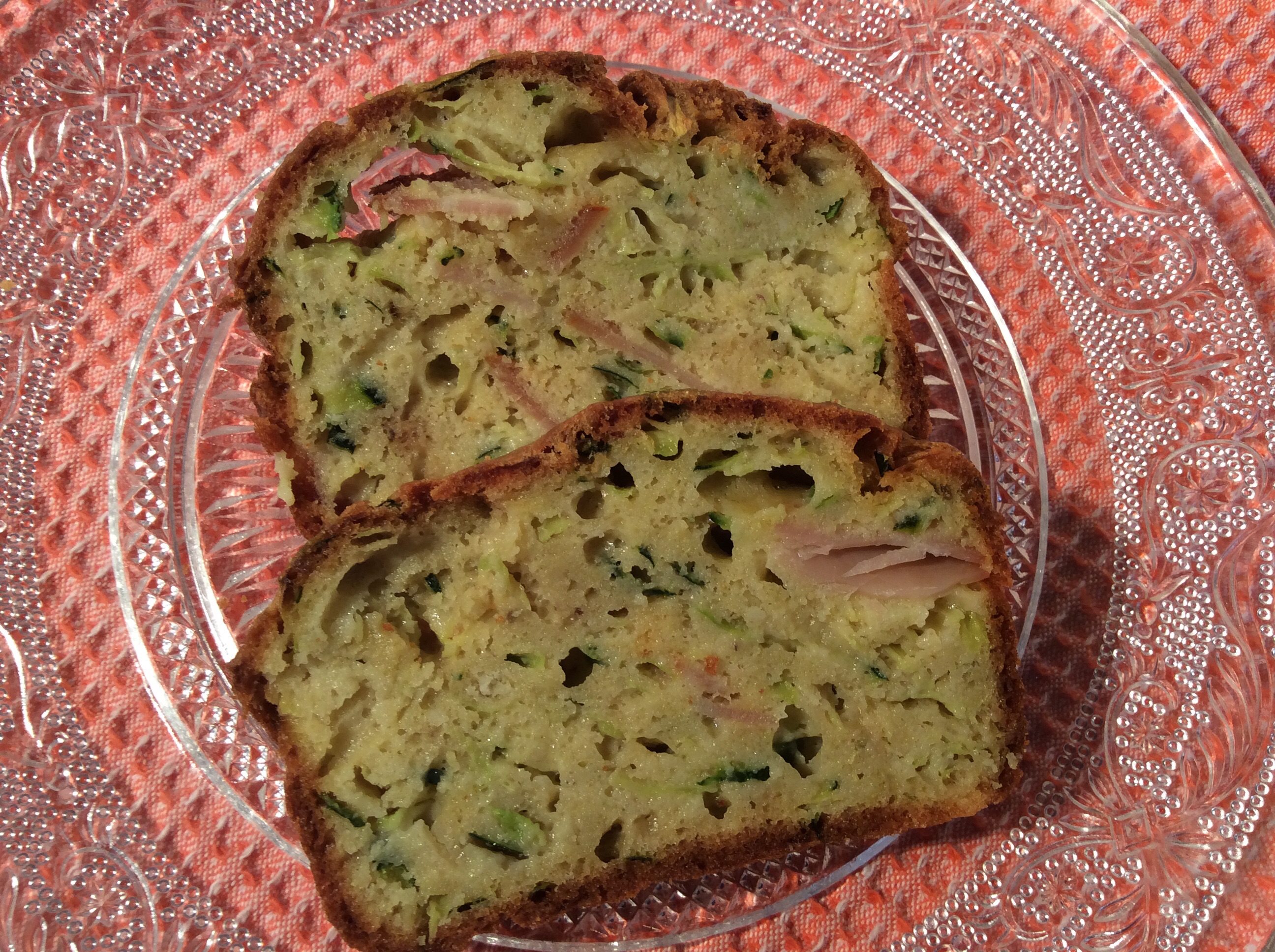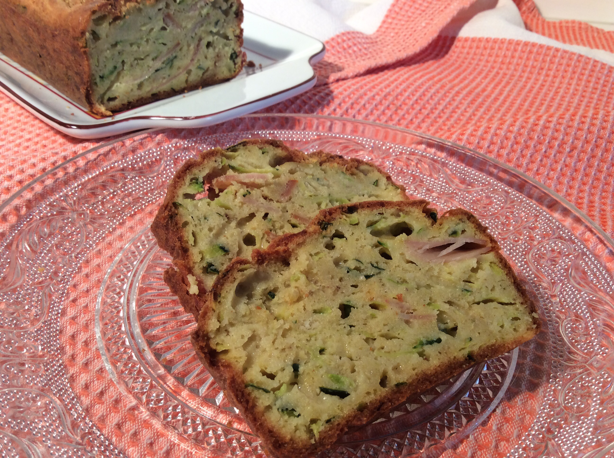 Il m’a fallu beaucoup de temps, et plusieurs expériences bien ratées avant de parvenir à un cake qui 1) ne cause pas de réaction chez mon intolérant et 2) qui soit satisfaisante pour nos papilles! En effet, j’ai eu bien du mal à trouver du “jambon” qui soit entièrement naturel: même en bio, mission quasi-impossible! Et puis j’ai découvert le “lomo”, un morceau de filet de porc séché, qui s’est présenté en tranches fines préemballées, et que j’ai donc utilisé dans cette recette qui contient aussi un peu de courgette râpée pour le moelleux du cake. J’espère qu’elle vous plaira! Et si jamais vous avez l’occasion de trouver du jambon de chez un producteur vous garantissant l’absence de conservateur, vous pourrez alors faire un “vrai” cake au jambon sans gluten, sans produits laitiers, sans sulfites!
