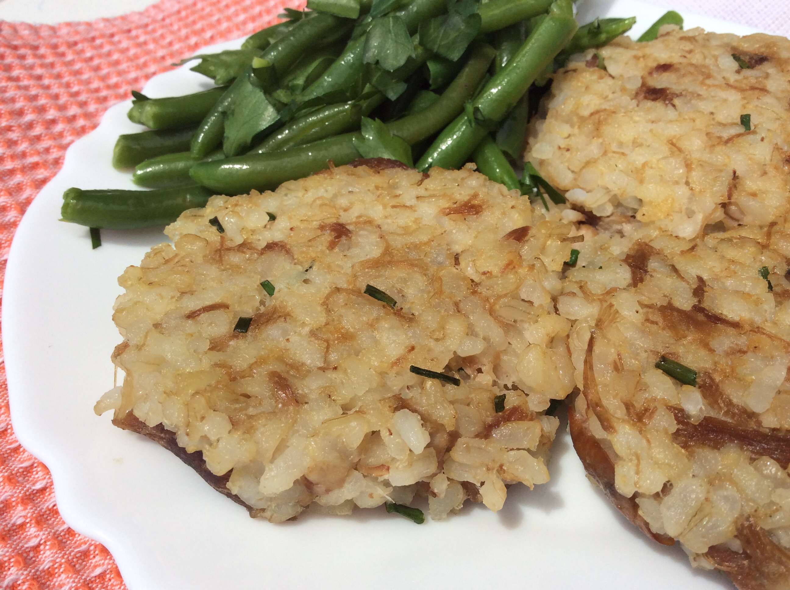 Au vu des chaleurs actuelles, j’ai réduit ma cuisine au minimum. J’essaie de préparer à l’avance tôt le matin, ou tard le soir… En début de semaine, j’ai confectionné ces croquettes en deux étapes: 1) la cuisson du riz, plus celle des champignons et 2) celle des galettes, qui n’a pas pris plus de dix minutes. Les champignons peuvent être ceux que vous préférez; dans mon cas, n’ayant pu trouver de champignons de Paris frais, je me suis « rabattue » sur des jeunes cèpes surgelés de chez Picard, après avoir vérifié auprès de leur service consommateurs qu’ils n’avaient pas subi de traitement aux sulfites.