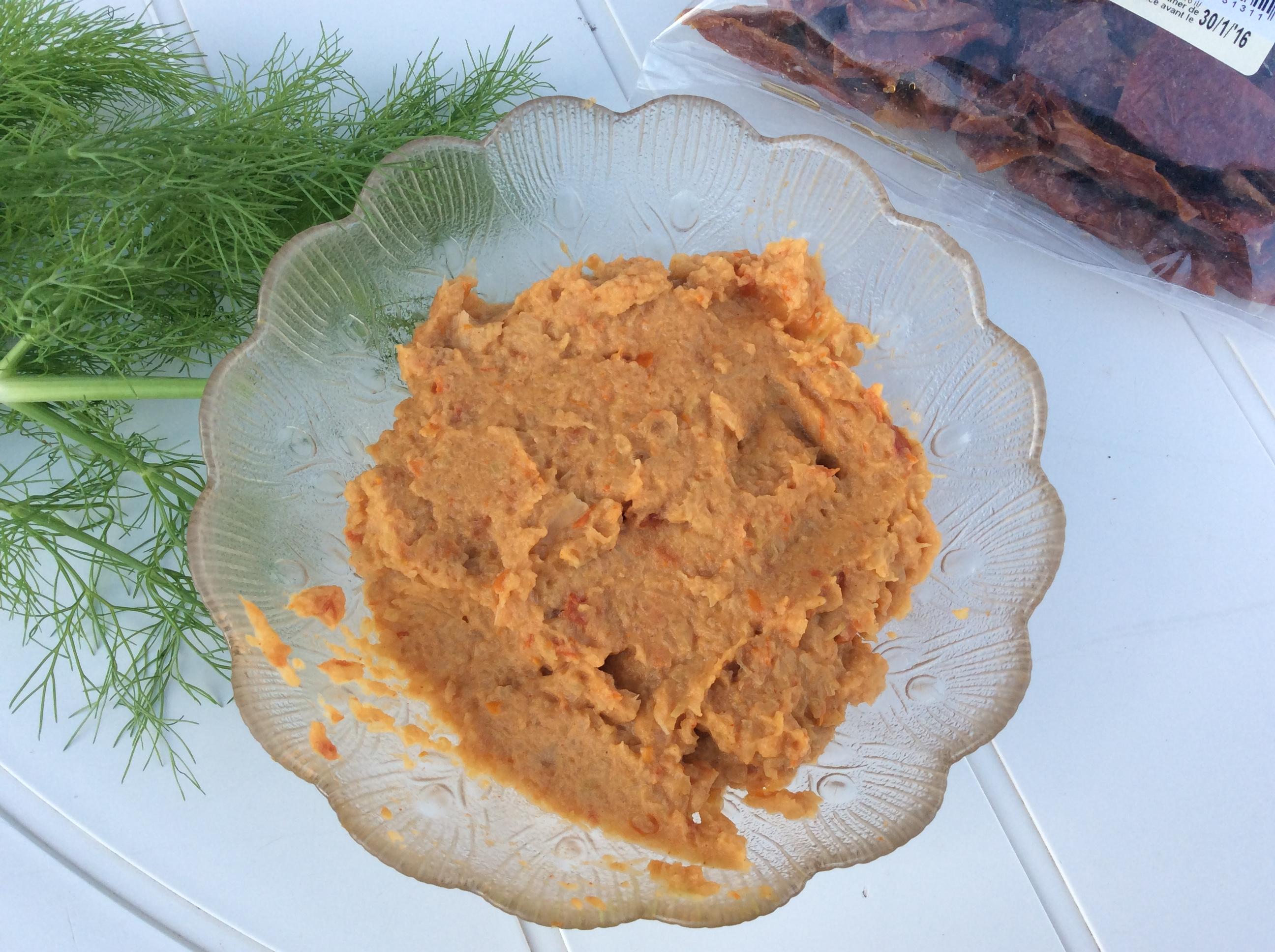 2. Les mixer avec les tomates séchées et un trait de crème végétale. Ne saler que si c’est nécessaire, après avoir goûté le dip: en effet, selon les tomates utilisées, il se peut que ce soit totalement inutile.