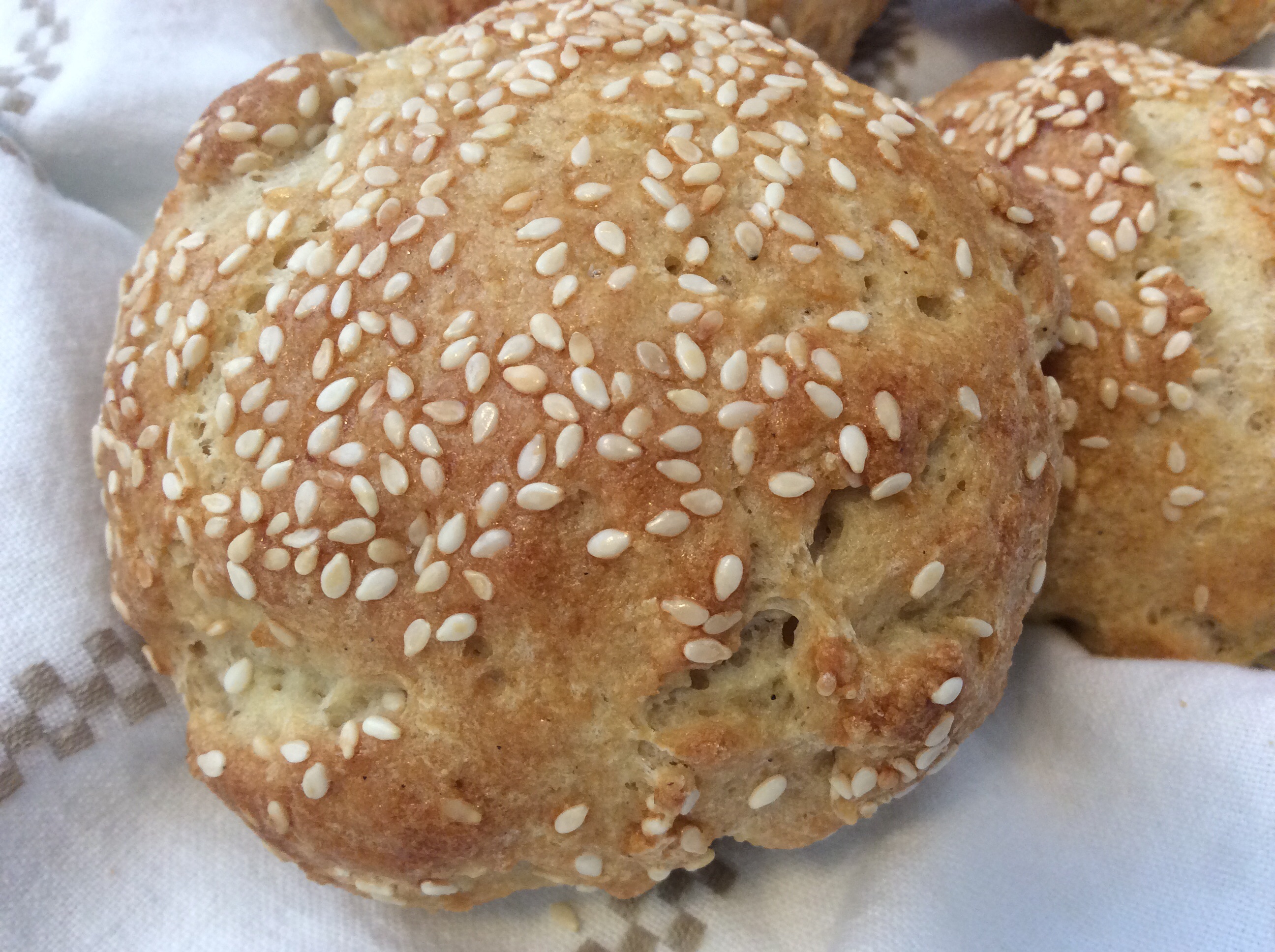 Une recette facile, relativement rapide, et grâce à laquelle vous allez pouvoir manger des sandwiches de tout type, par exemple hamburger: en n’y mettant qu’un vrai steak haché (viande hachée sous vos yeux par votre boucher), une rondelle de tomate, de la laitue, et de la mayonnaise maison faite à partir d’un jaune d’oeuf et d’huile, vous mangerez sain tout en vous régalant. Autre intérêt: on peut préparer la pâte la veille, et la laisser lever dans le secret de son réfrigérateur jusqu’au moment où l’on décide de faire cuire les pains. Véridique, testé pas plus tard que la semaine dernière… Bluffant, non? Nous sommes partis en emportant sur le siège arrière de la voiture des pains qui humaient tellement bon que j’avais l’impression d’être chez Pat****n! (chez qui je n’entre plus depuis des lustres…) A midi, nous avons tranché les pains en deux, tartiné chaque moitié de rillettes de maquereau maison, rajouté les rondelles rouges et la feuille verte, et le tour était joué. Dommage, je n’ai pas pris de photo! La recette d’origine vient des Etats-Unis mais je l’ai largement modifiée: farines adaptées, moins de sucre et rajout d’un blanc d’oeuf pour le moelleux.