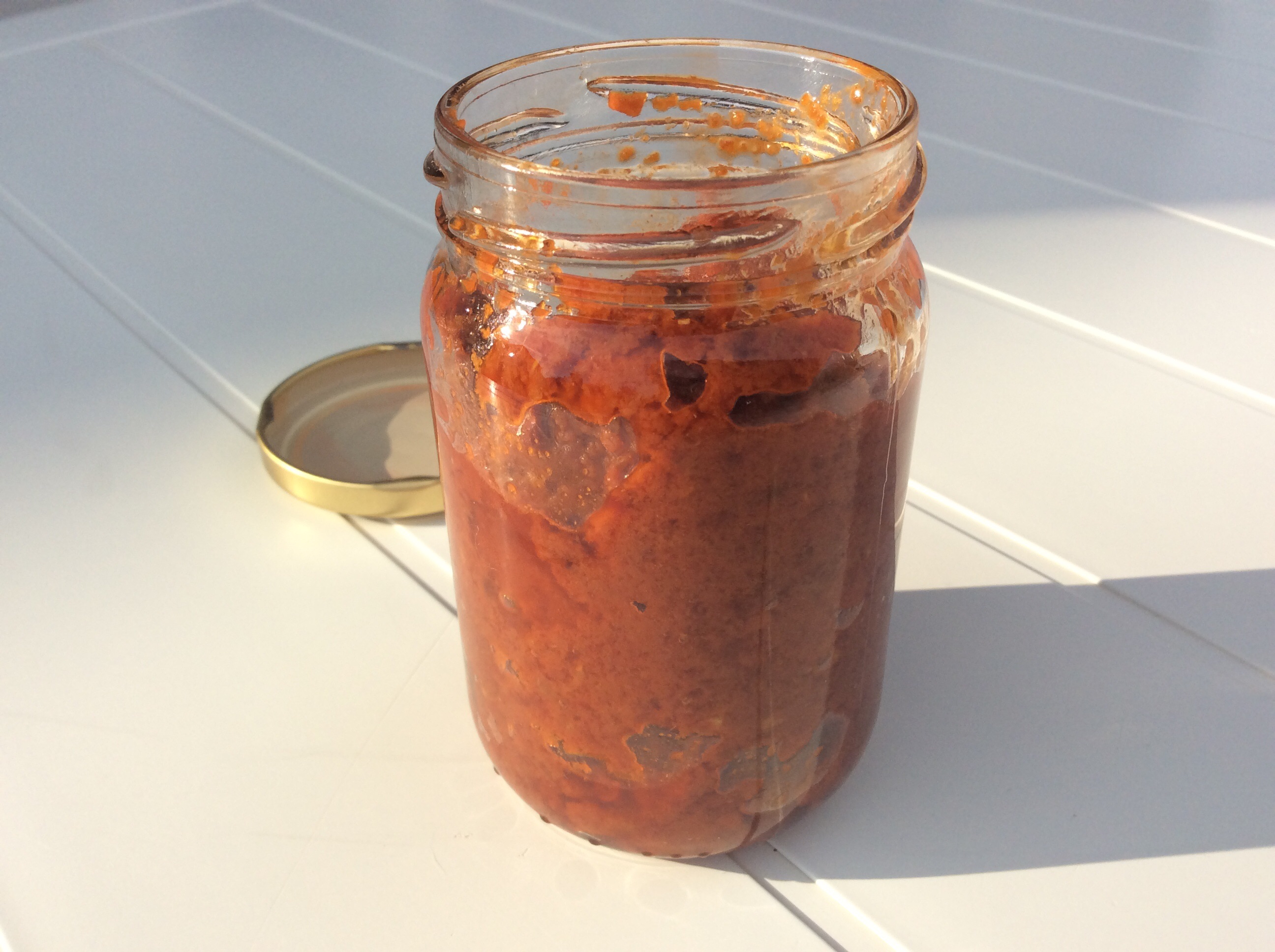 – 50 g de tomates séchées (ingrédients: tomates, sel marin, c’est tout; j’en ai trouvé de marques différentes en bio et tout récemment encore en supermarché ordinaire vers le rayon fruits et légumes, mais je n’ai pas eu l’occasion de tester celles-là sur mon intolérant).