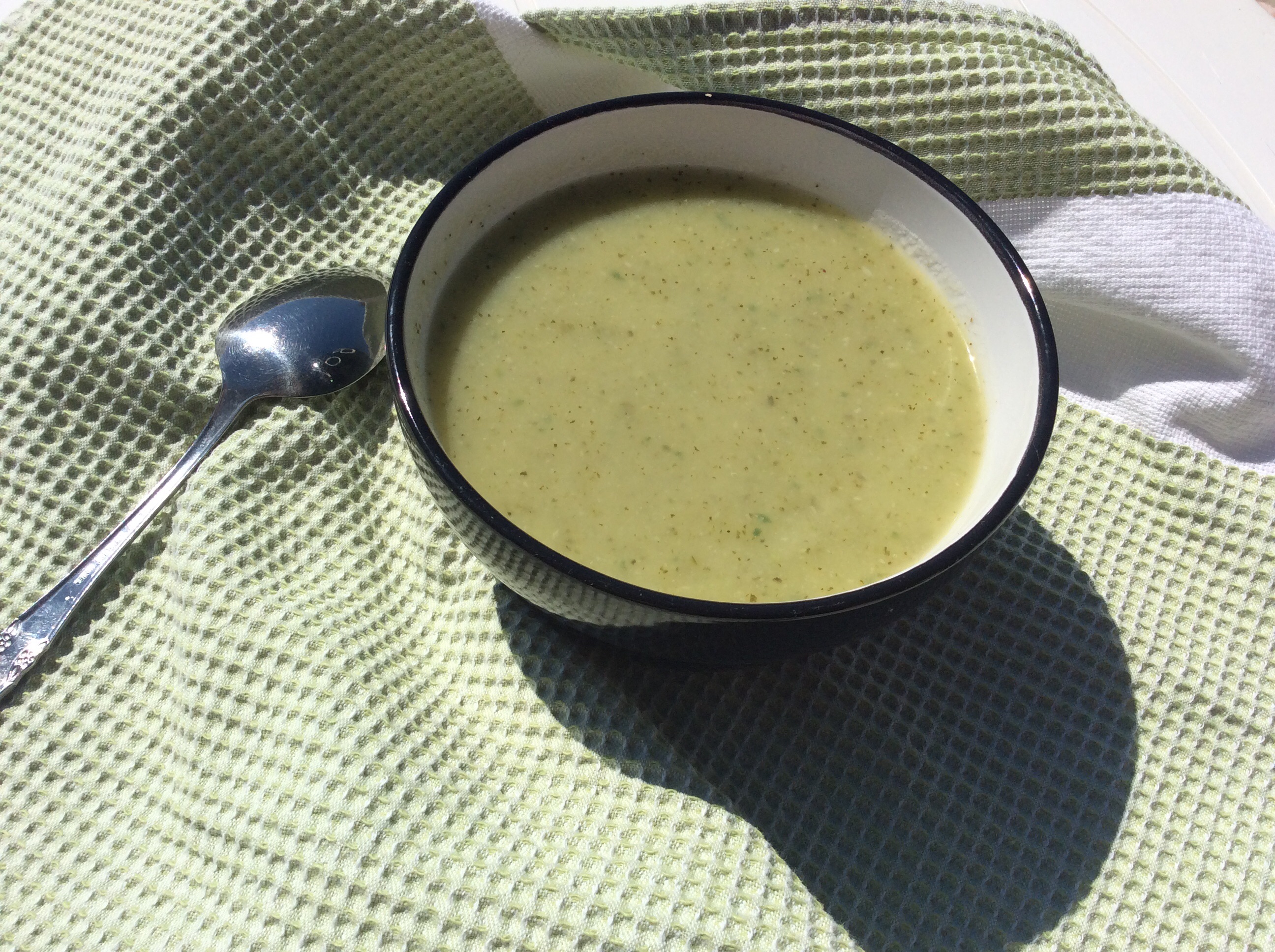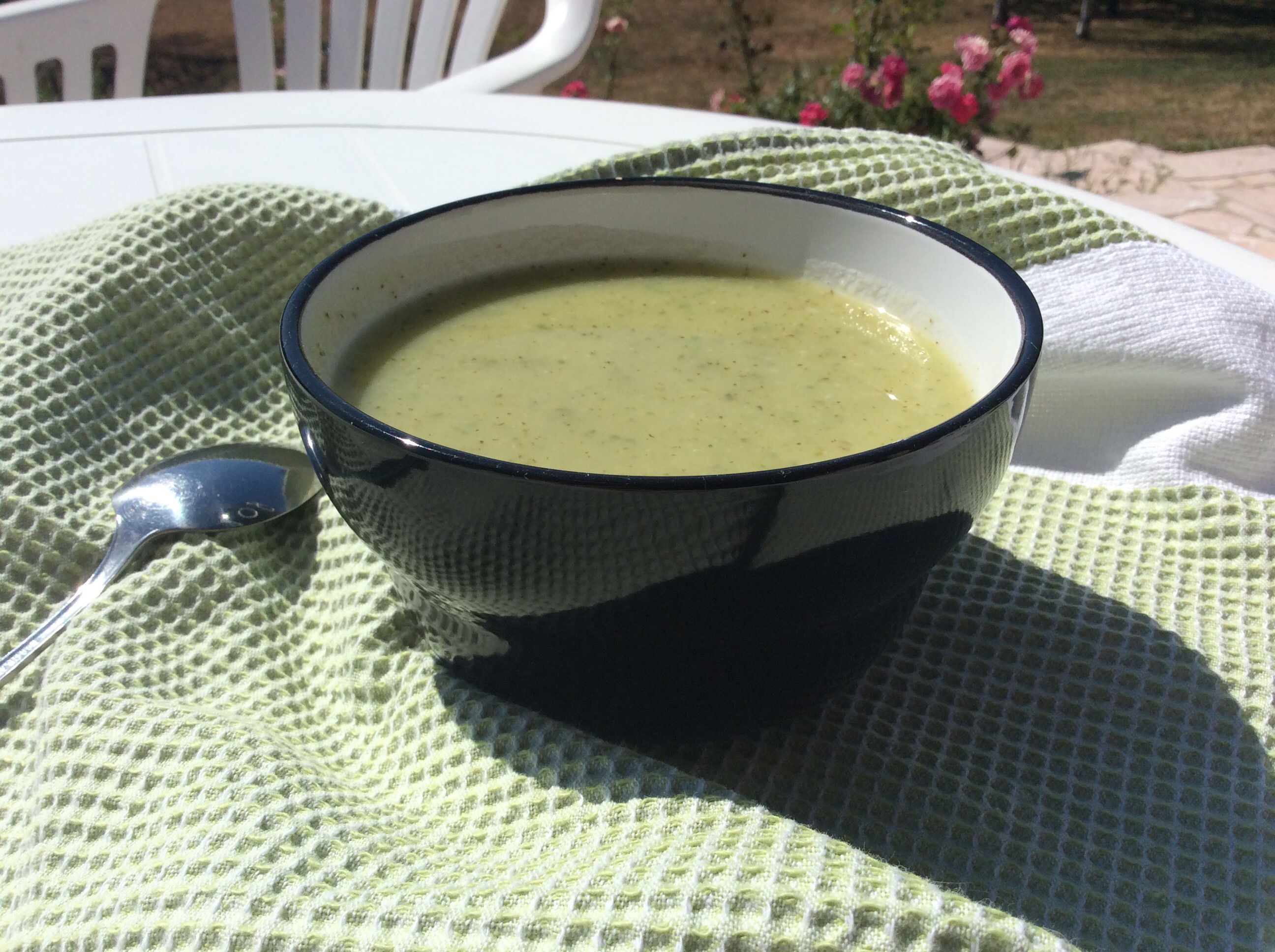 2. Mixer les légumes sortis de l’eau de cuisson avec le concombre jusqu’à obtention d’un mélange lisse. Ajouter l’eau de cuisson jusqu’à la consistance désirée. Un gazpacho est plus liquide qu’une purée; si je le dis c’est parce que je n’ai pas toujours su doser mon affaire ;-). Ajouter une lichette de crème végétale, goûter et rectifier l’assaisonnement; parfois j’emploie de l’Herbamare et du poivre blanc du moulin. Mettre au frigo et servir très frais!