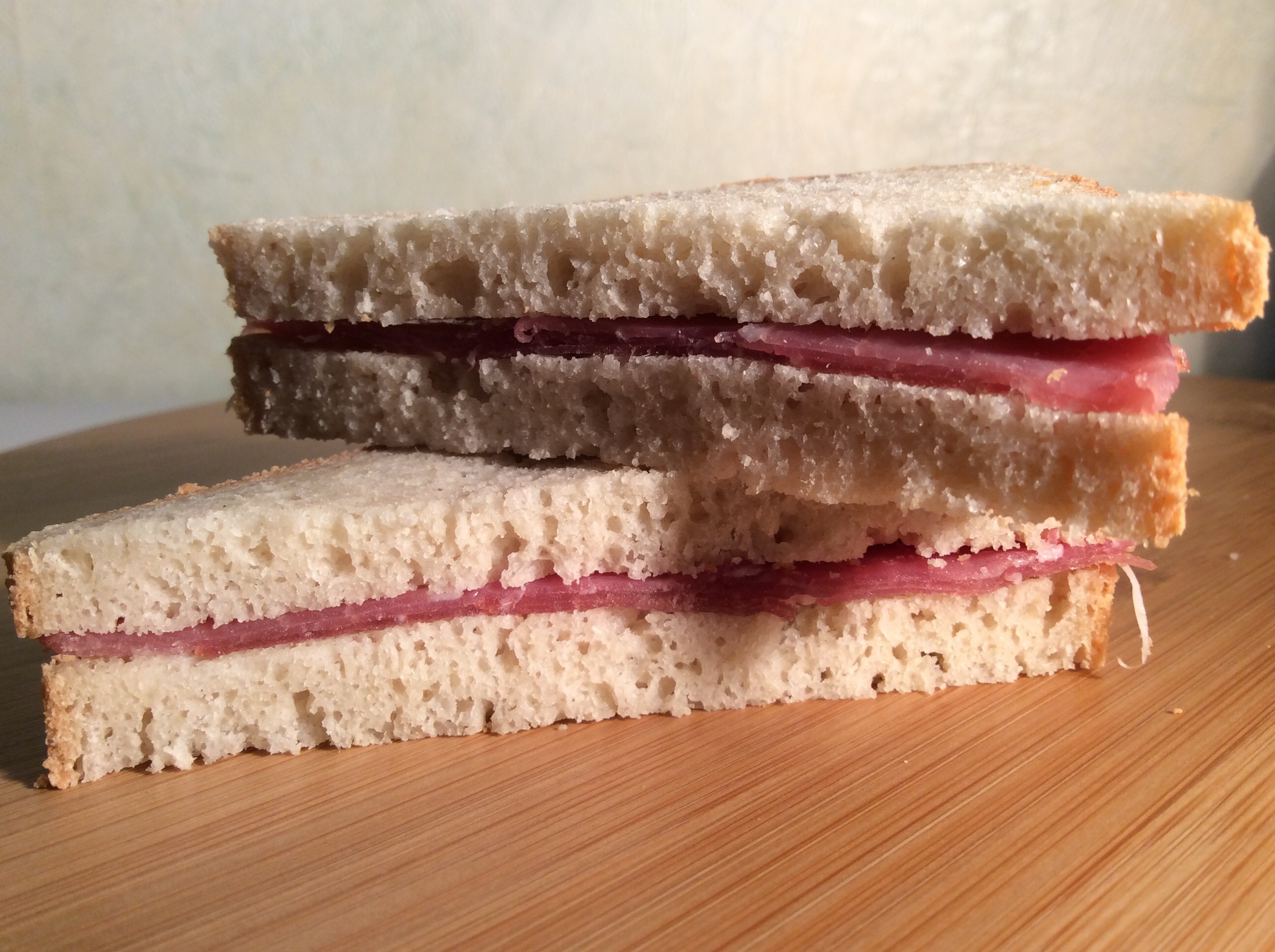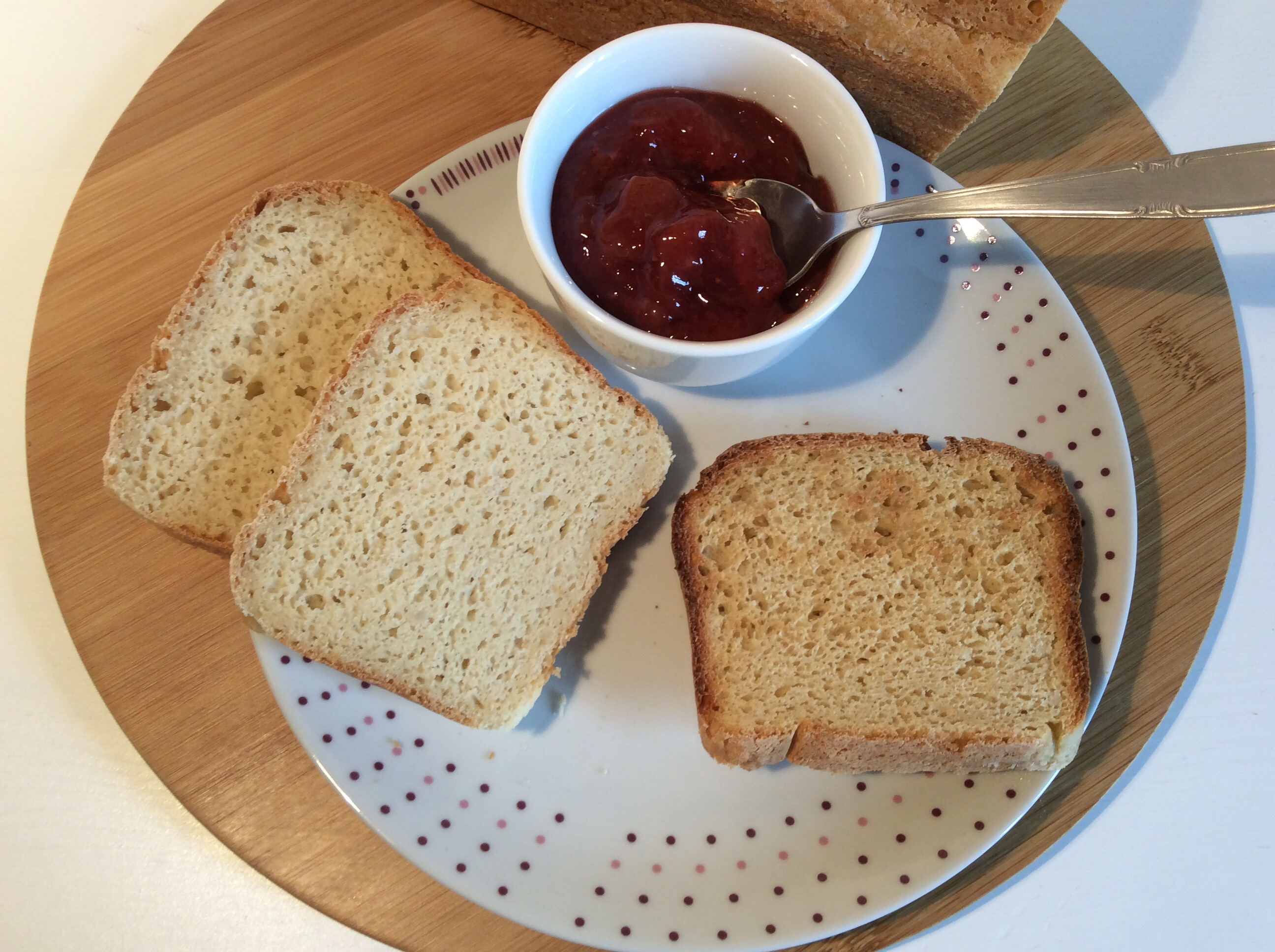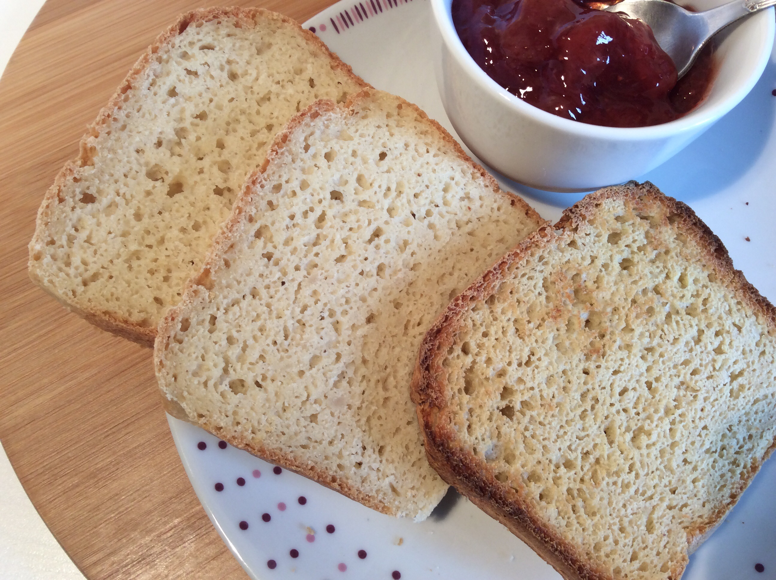 Depuis que je fais les pains pour hamburgers, je me suis souvent dit que ce type de pâte devrait convenir parfaitement pour un pain de mie maison. J’ai donc tout bonnement doublé les quantités d’origine, mis la pâte dans un moule à cake, enfourné et prolongé un peu la cuisson. Ce pain, utilisé frais (dans les 36 heures qui suivent la cuisson) est excellent pour faire de petits sandwiches (avec par exemple une tartinade d’avocats au thon). Sinon, on peut le passer comme les autres au grille-pain, ou encore le découper en tranches avant de le congeler. Le seul bémol à mon avis est que l’on doit utiliser deux œufs entiers + 2 blancs d’œuf. J’ai l’intention de la retester avec un substitut d’œuf. (type graines de chia ou de lin trempées), et peut-être même de remplacer l’un des blancs par autre chose – mystère, mystère… Il vous faudra un peu de patience, le temps que toutes les tranches aient disparu de mon congélateur 😉