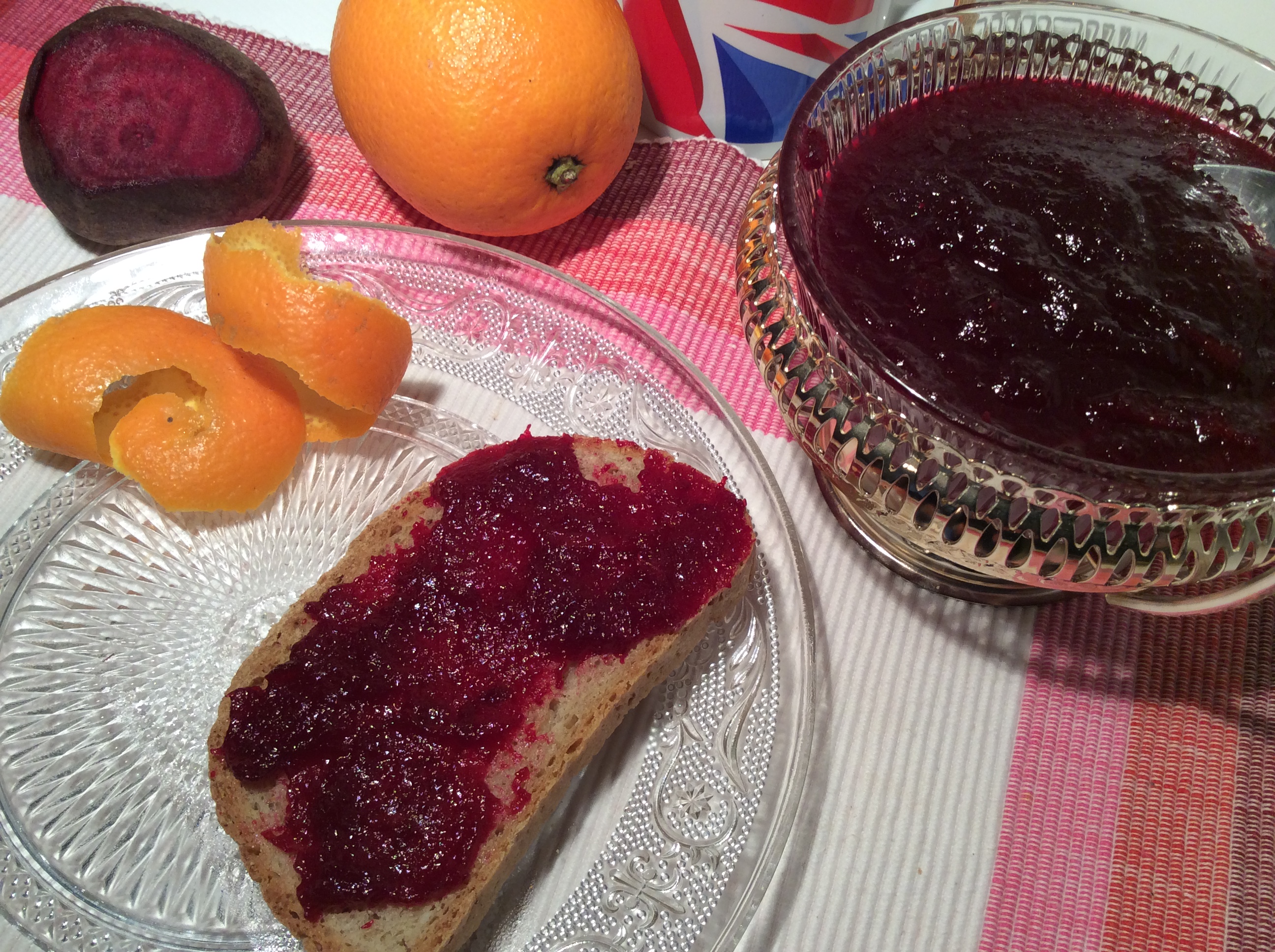 Mes passages chez ma maraîchère ou dans mon magasin bio sont toujours l’occasion d’échanges sympathiques, et j’en ressors aussi parfois la tête fourmillante d’idées culinaires saugrenues! Et quand le résultat me convient, je me dois de les partager. Voici donc une recette de confiture maison à la betterave dont le goût douceâtre est coupé par celui de l’orange, en particulier de son zeste… Je laisse à vos papilles le soin d’apprécier ce mariage! Testé chez nous avec des crêpes et sur du pain sans gluten, à deux la moitié du pot a été engloutie en un rien de temps. Oups, attention, tout ça c’est du sucre, alors, pas de dessert dans les jours à venir!