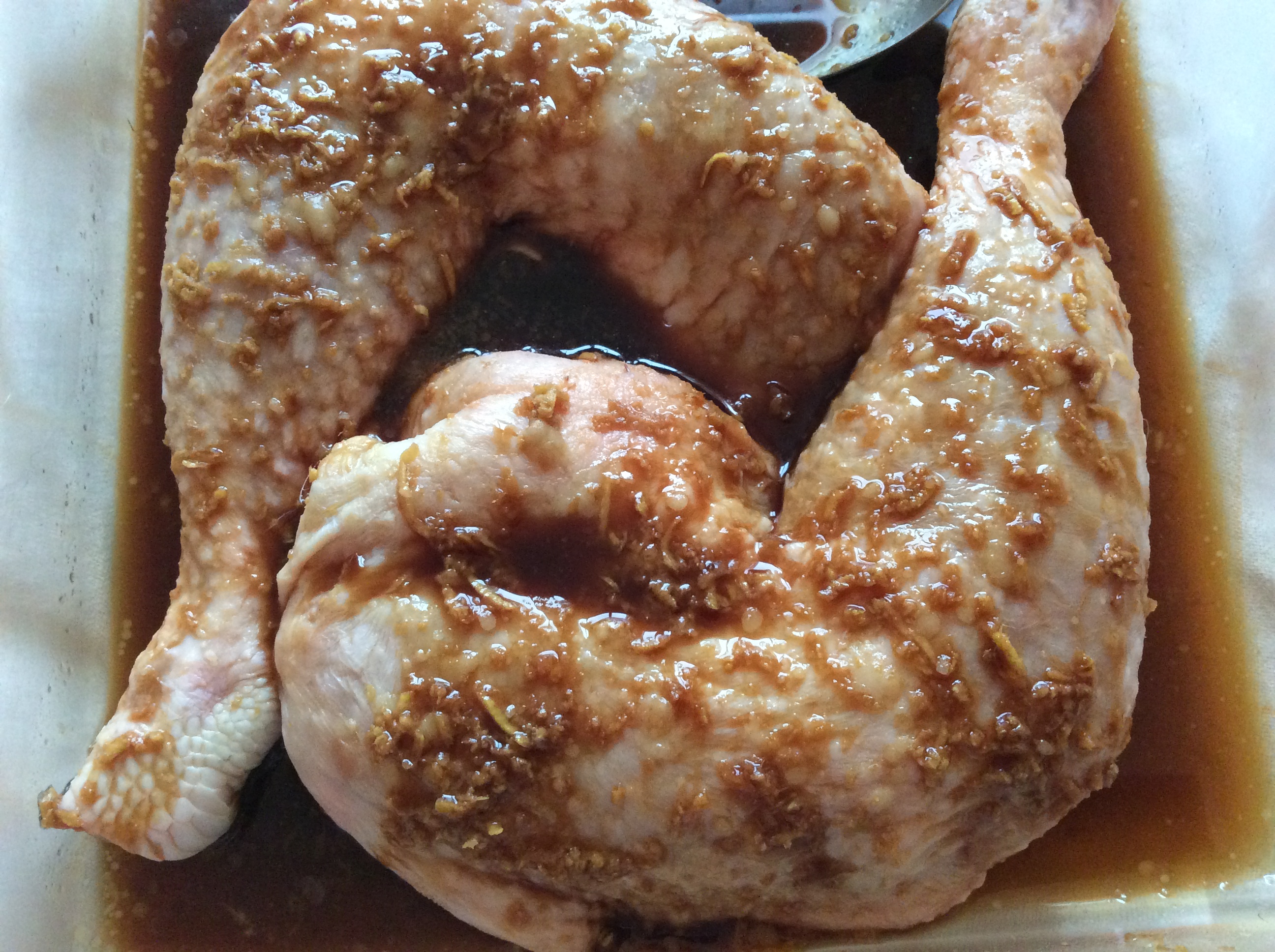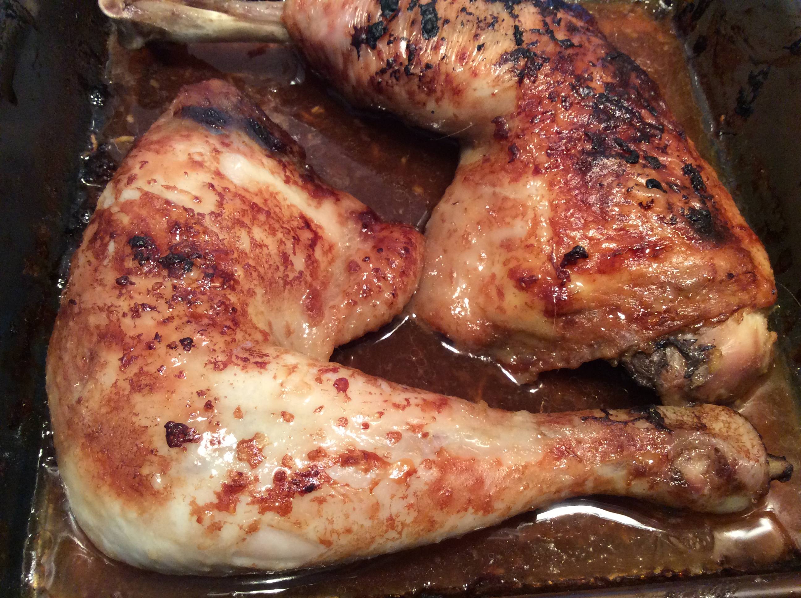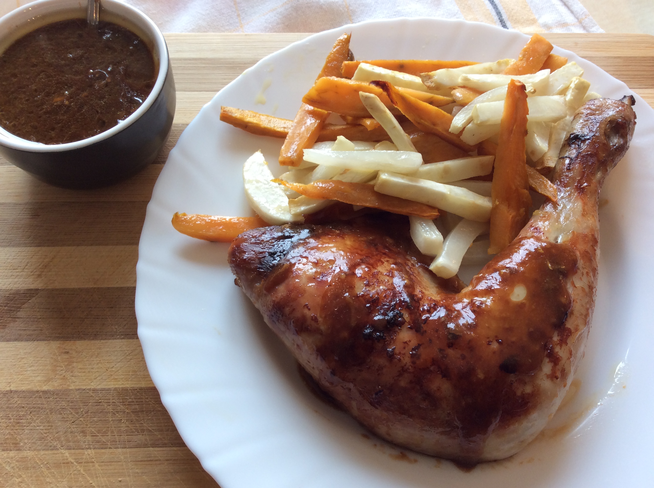 L’un des soucis récurrents des personnes qui, comme moi, doivent cuisiner sans sulfites, est de pouvoir préparer simplement et rapidement des plats. Celui-ci ne requiert qu’une marinade prête en 5 minutes, le reste se faisant tout seul au four en moins d’une heure. Ce plat s’apprécie également réchauffé, donc peut se prévoir la veille (sauf les légumes) pour le lendemain. Il est relevé comme je l’aime, avec du gingembre qui booste nos cellules immunitaires! Les proportions données sont pour deux cuisses de poulet, auxquelles on peut bien évidemment substituer les morceaux de son choix.