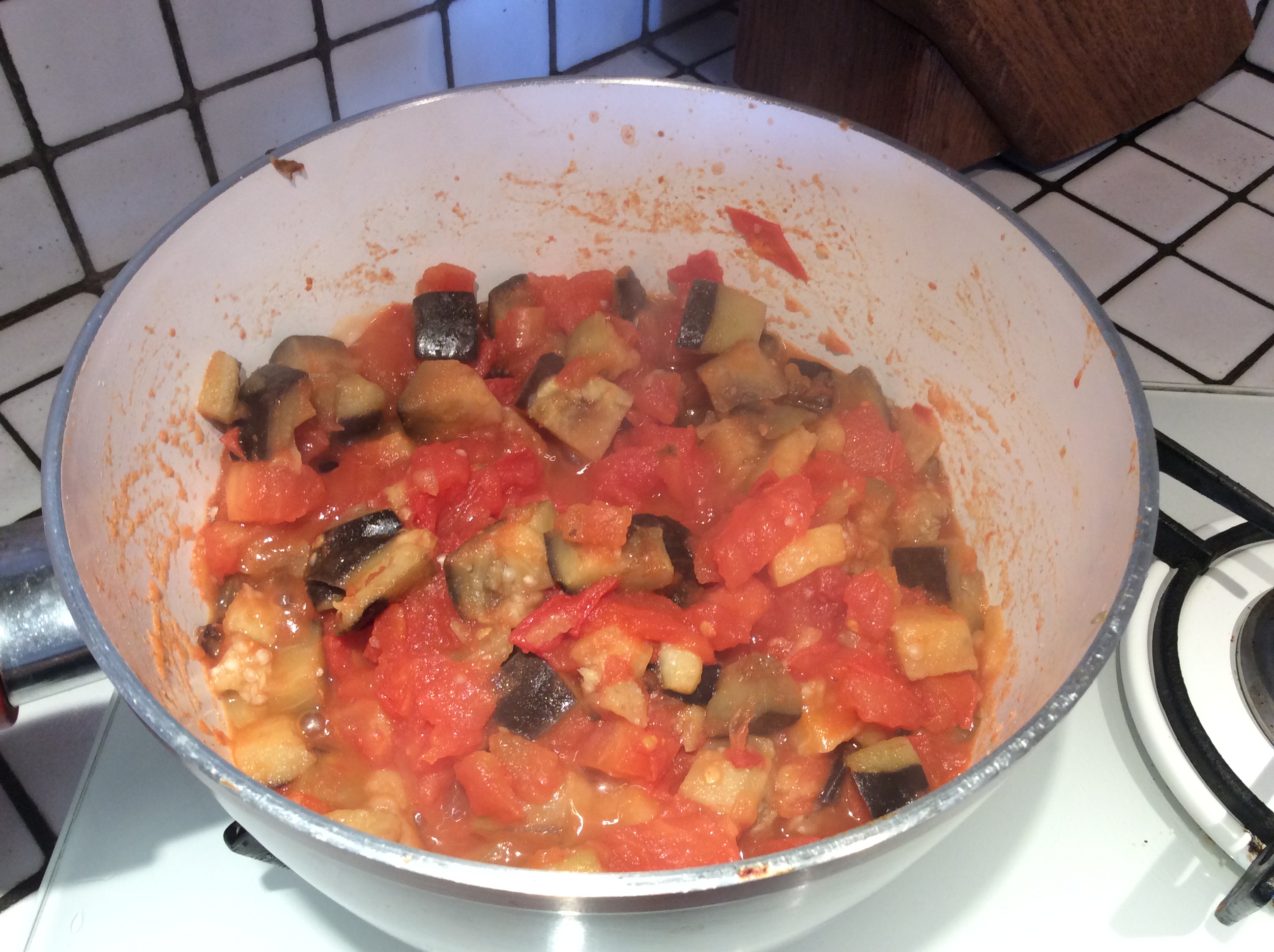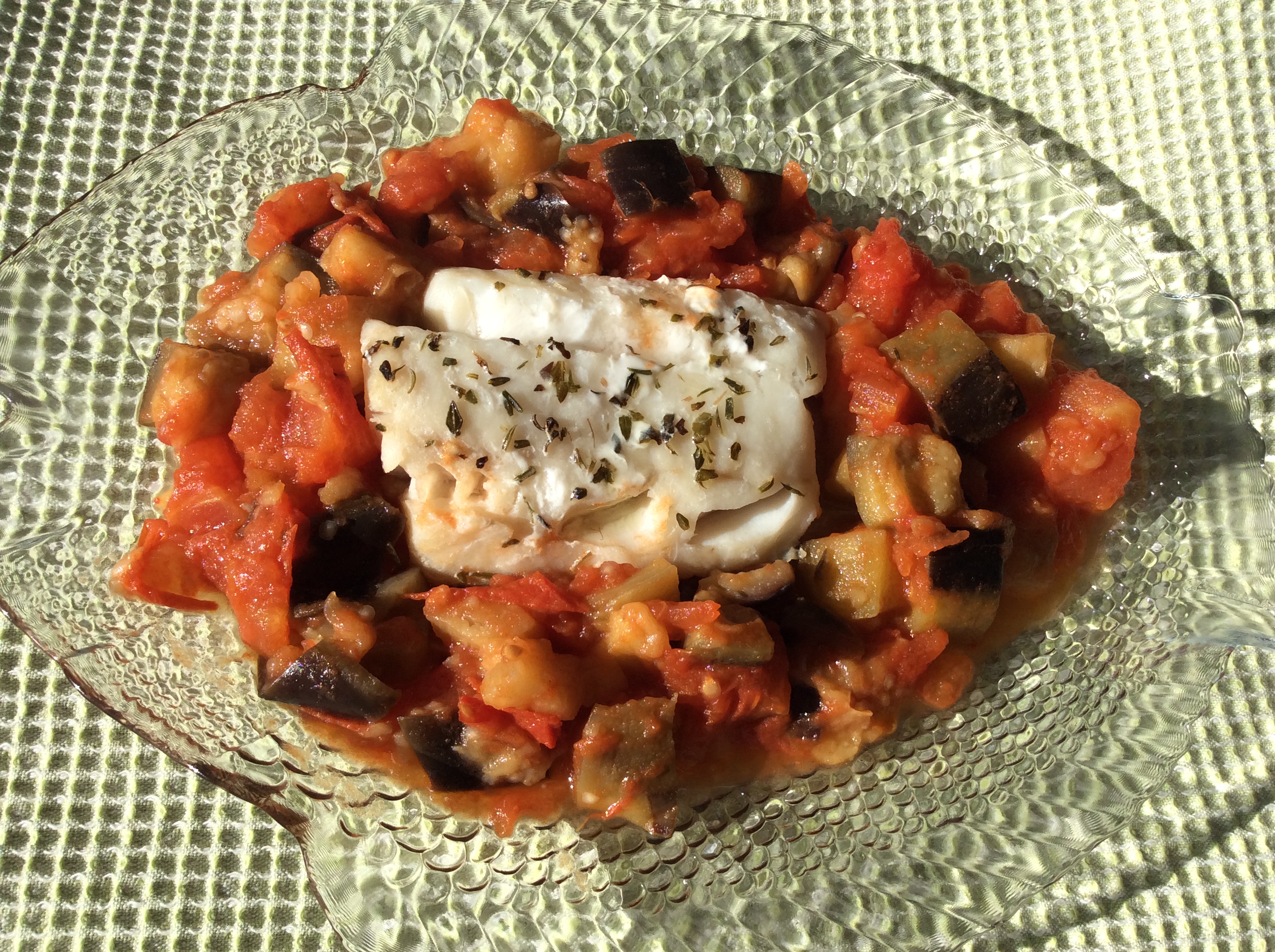 En plein mois de novembre, on trouve encore des tomates bio qui n’ont pas poussé sous serre! Il fallait bien que le réchauffement planétaire offrît (ouuuuh, le style!) quelques avantages, en plus de faire des économies de chauffage et de sèche-linge… Tomates + aubergine pour accompagner mon poisson, j’ai préparé ce repas sans stress pour le déjeuner d’aujourd’hui, et puis je me suis dit que si je devais le publier, il fallait que ce soit tout de suite, avant que les températures ne redeviennent plus raisonnables et que vous ne trouviez plus de “vraies” tomates! C’est donc en pleine digestion que je vous la transmets: