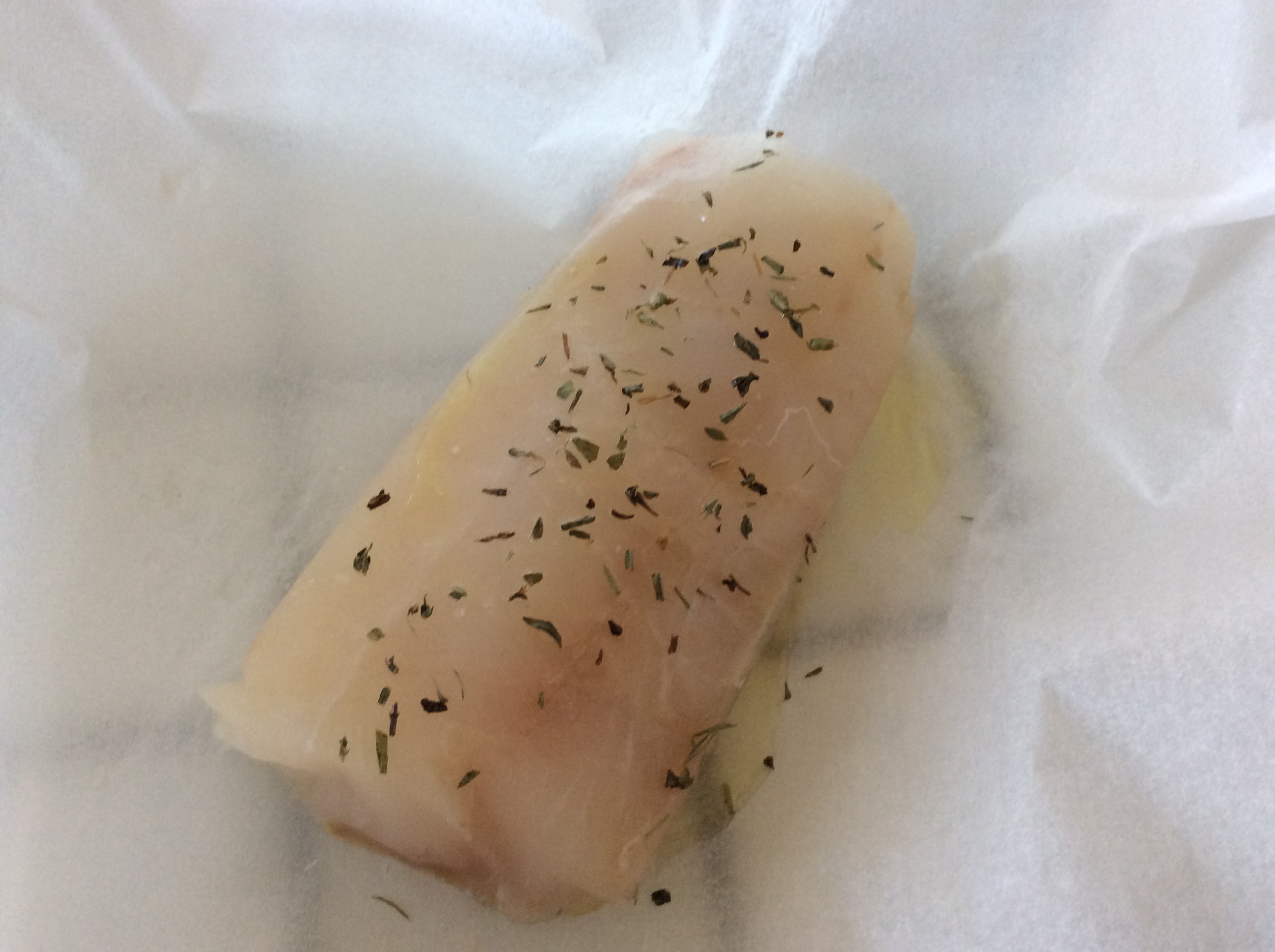 4. Pendant ce temps, saler les 2 morceaux de poisson, les aromatiser avec un peu d’herbes de Provence et un filet d’huile, et les mettre à cuire au four en papillotes dans 2 feuilles de papier cuisson. (20-25 minutes, selon l’épaisseur du poisson)