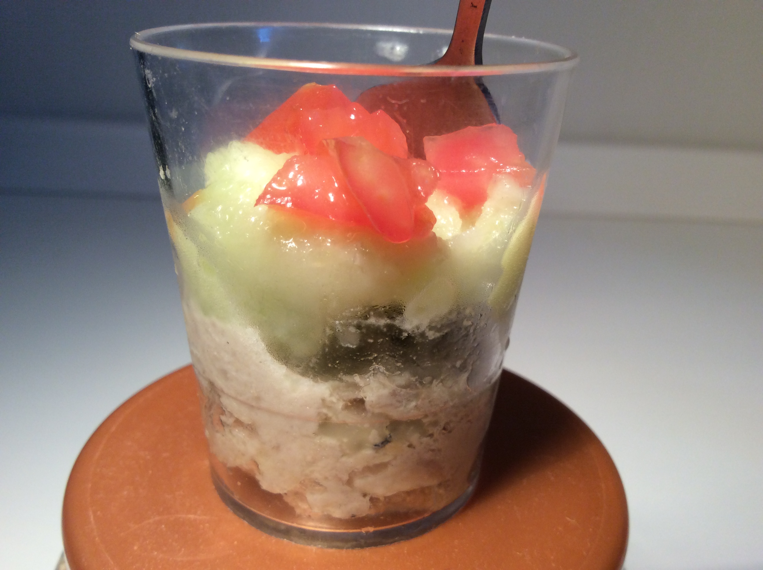 verrines rillettes de maquereau, sorbet de concombre et dés de tomates