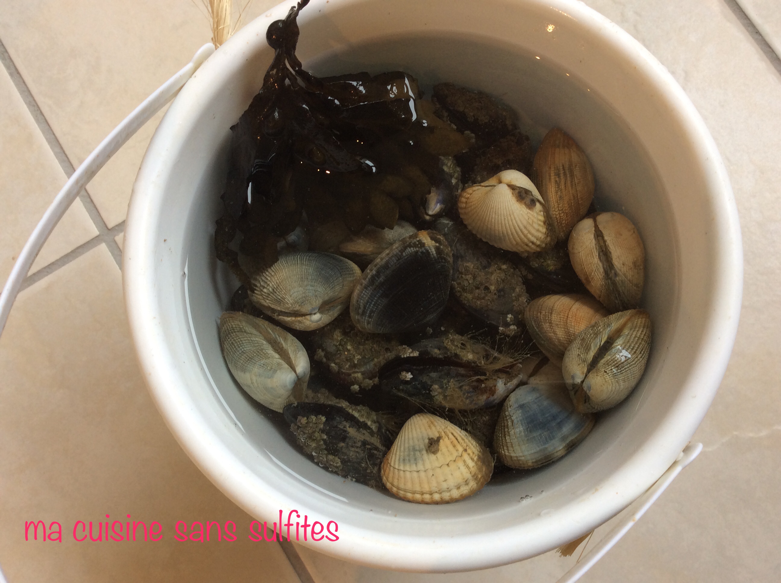Cet instrument dans mes mains est moins dangereux que des dents de râteau pour les pauvres petits crustacés! Et en plus il me sert de chronomètre et garde-fou: au bout d’une heure et demie, deux heures maximum, je commence à avoir une ampoule qui se forme là où je la tiens : il est temps alors de rentrer, que le seau soit plein ou pas, avant que la marée revienne, ce qu’elle fait au galop à certaines époques de l’année ! Je suis donc allée pêcher cet après-midi, pour me faire plaisir pour laisser libre cours à mes instincts néandertaliens, enfin, pour que ma Moitié puisse manger des coques, des palourdes et des moules hyper fraîches et non traitées, donc sans sulfites !