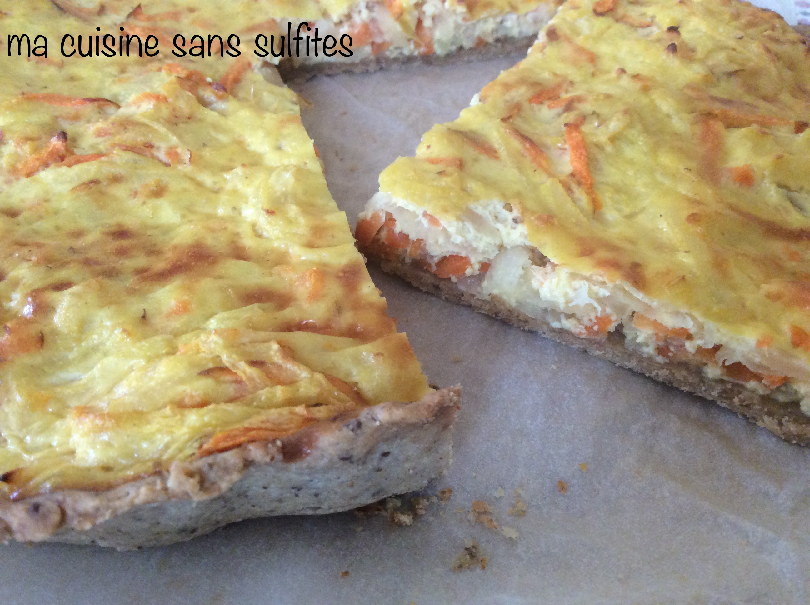 Comme j’essaie de faire encore avec les légumes à ma disposition sur les étals du nord de l’Auvergne, c’est de chou-rave et de carotte d’hiver que ma tarte se compose, inspirée il y a quelque temps déjà par celle-ci. La pâte est sans gluten et faite maison. Comme j’ai de la farine de millet à utiliser urgemment (la date sur le paquet est dépassée ^^) c’est elle, au lieu de ma farine chouchou, la farine de teff, qui me sert de base en ce moment, et je n’en suis pas déçue. Quand je fais cette tarte salée, au lieu de plusieurs œufs comme dans une quiche traditionnelle, je n’en utilise qu’un seul pour lier le tofu soyeux. Ça tombait bien, les autres étant partis dans le framboisier !