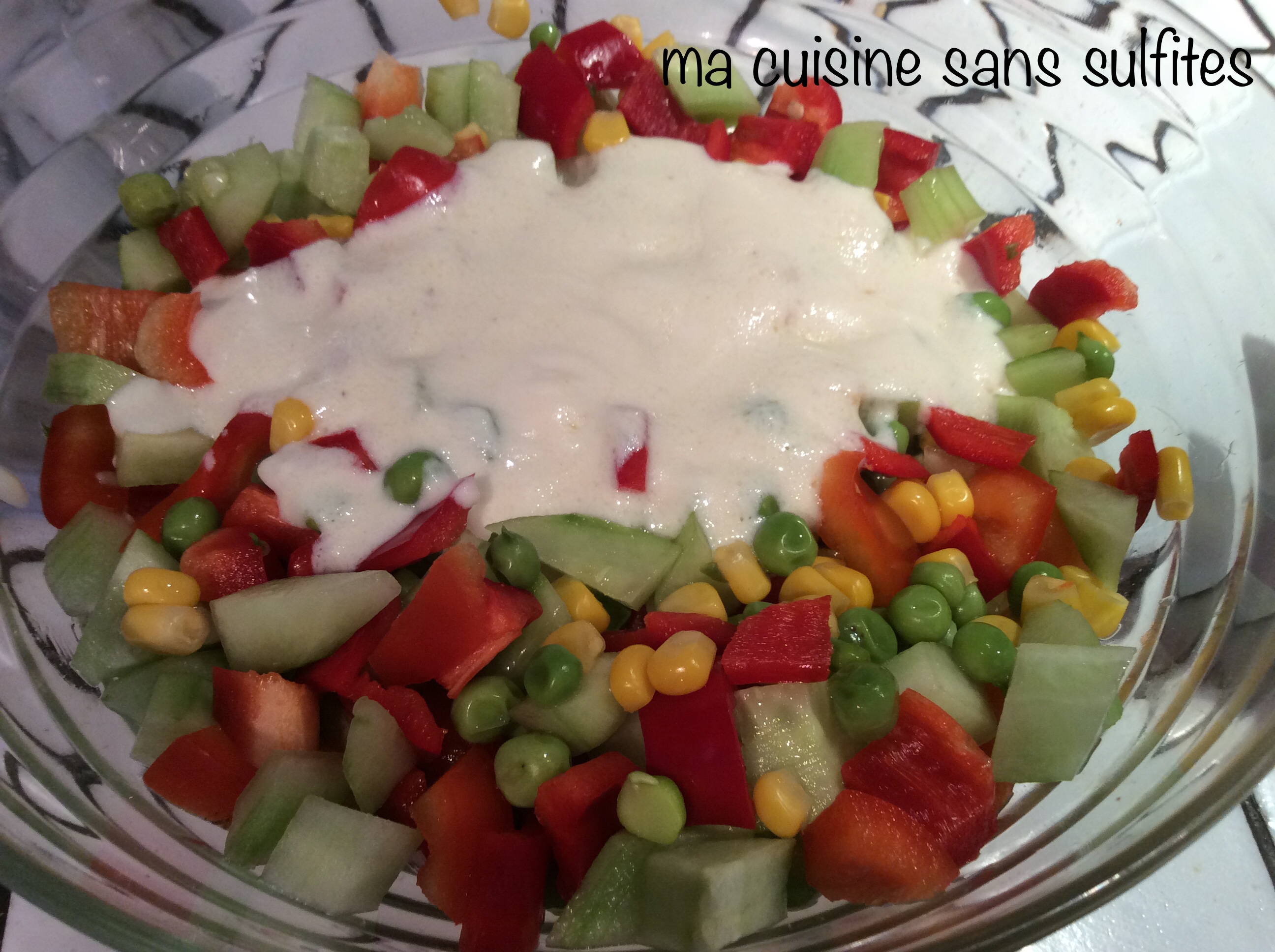 Quand il fait très chaud, la simple perspective de faire une vraie mayonnaise me fatigue; c’est pour ça que je la remplace par un mélange de yaourt végétal, huile d’olive et jus de citron. Mais vous pouvez en faire une, à condition d’avoir une moutarde bio sans sulfites (donc au vinaigre d’alcool), vous pouvez aussi prendre un autre type de yaourt, de brebis par exemple.  De même, on peut remplacer le maïs par du riz cuit, le poivron par des carottes cuites, les petits pois par des haricots verts… L’idée est de marier des couleurs différentes!
