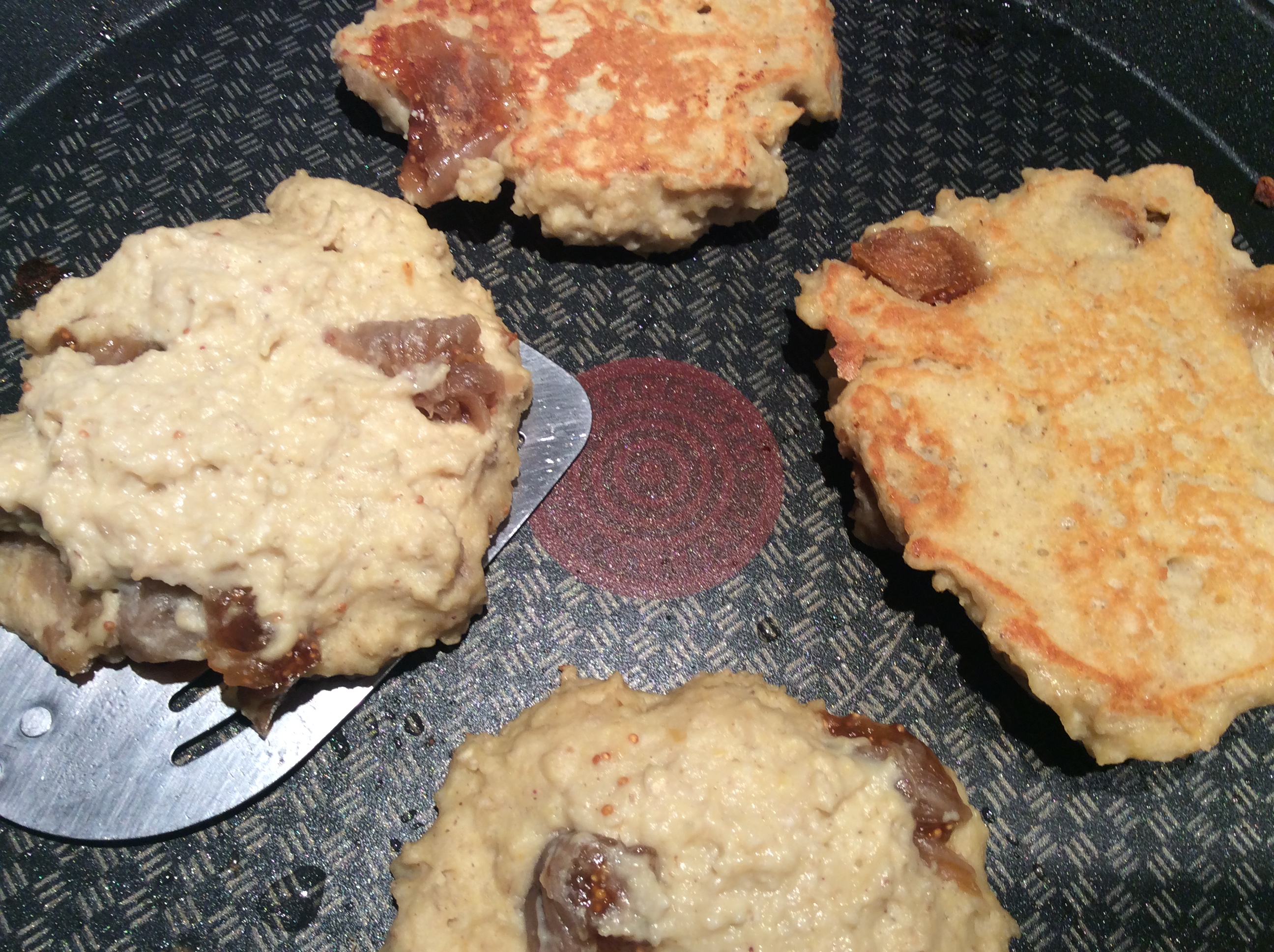 5. Bien chauffer une poêle huilée à l’huile d’olive ou de coco, puis baisser le feu avant de verser 4 louchées de pâte. C’est à ce moment que j’ajoute les morceaux de pruneaux à mes pancakes; mais on peut les mettre dans la pâte avant de la verser dans la poêle. Cuire à feu doux, 6 minutes pour la première face, et 1 à 2 minutes de plus pour la deuxième.