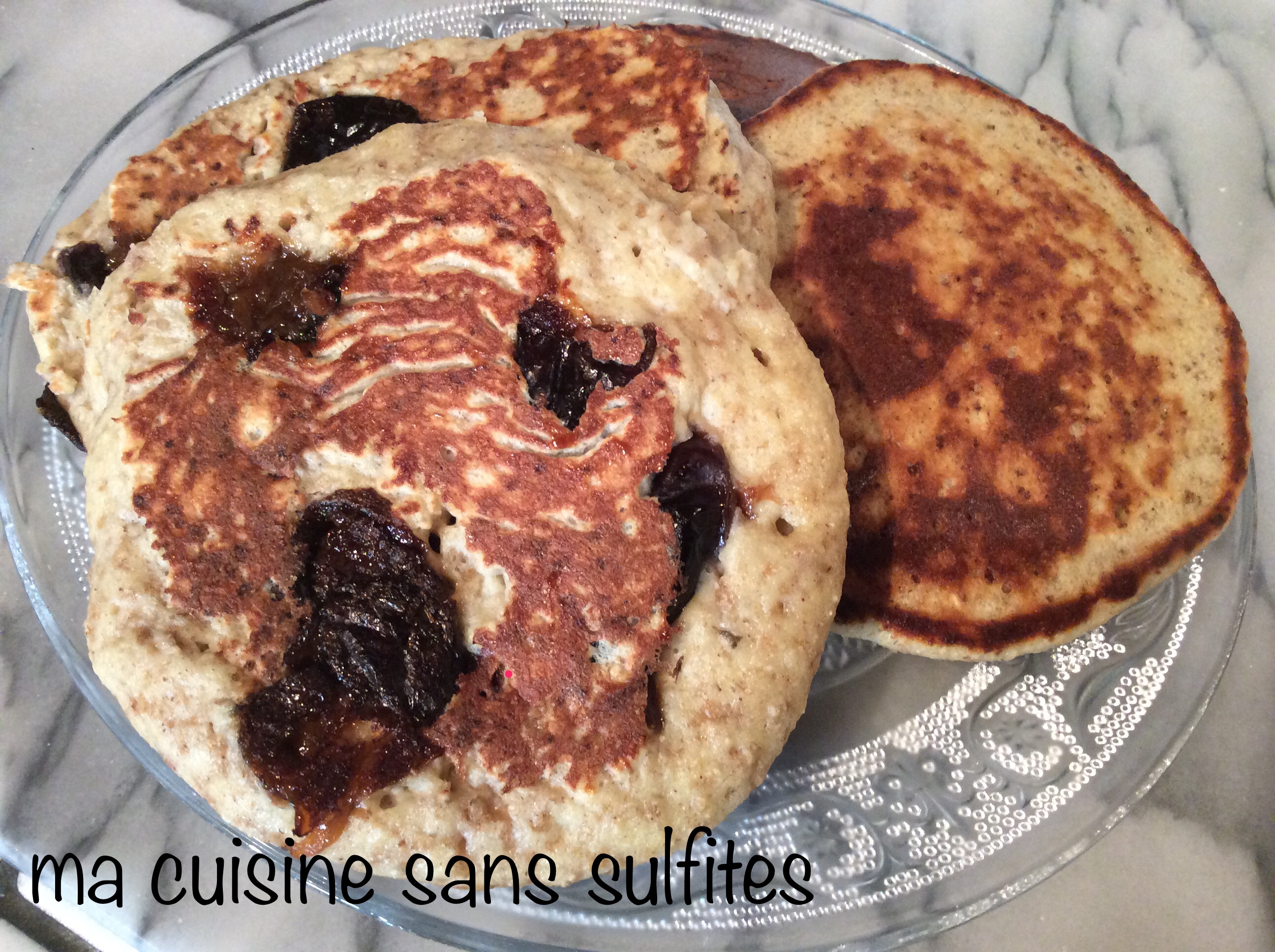 Notre cognassier s’est cassé la figure au printemps. Eh oui, lui aussi ! Mais contrairement à moi, il ne s’en n’est pas remis. Heureusement, j’ai un oncle qui m’a proposé des coings de son jardin, et il m’en reste un peu de la récolte de l’an passé sous forme de compote, au congélateur. Alors je fais des pancakes, avec plusieurs options côté farines, toutes testées ici (ma fille appréciera, je sais que la farine de châtaigne ne rentre pas dans son budget d’étudiante!) et la possibilité d’y ajouter des pruneaux… afin de compenser les effets « secondaires » et indésirables de ce fruit d’automne ! Mes pancakes sont moelleux et peu sucrés; ma Moitié, qui n’aime pas vraiment les pruneaux, même bio, les mange nature. Enfin, « nature », c’est façon de parler : il les surmonte d’un peu de beurre ghee, puis sort le sirop d’agave pour arroser tout ça ! Je ne sais pas si les pruneaux sont un problème pour les intolérants aux sulfites ; en bio, je ne pense pas, mais je ne peux pas le garantir, ne les ayant pas essayés sur mon cobaye sur ma Moitié.😬