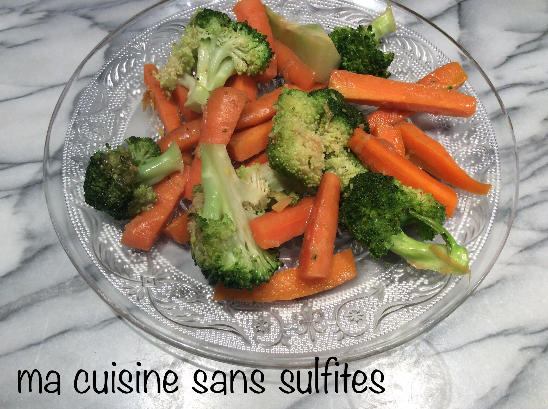 La cuisson de ce plat de légumes, commencée à l’huile de coco et finie par un ajout de crème de coco adoucit le goût du brocoli, riche en soufre mais bien toléré quand même par ma Moitié, et largement plus apprécié de cette façon que cuit à la vapeur ou à l’eau ! Comme il est rarissime que nous ne mangions qu’un seul légume par repas, j’ai choisi des carottes pour lui tenir compagnie !