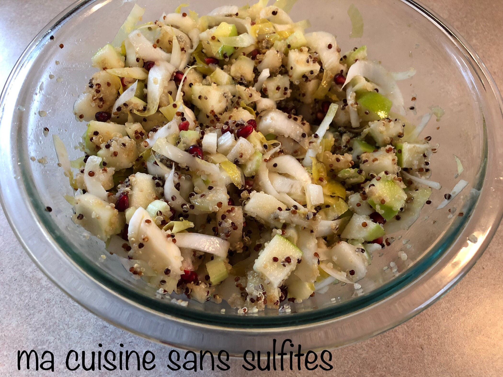 Je m’y prends à l’avance pour vous présenter une salade bien de saison, sans prise de tête, et très appréciable avant, ou après, des jours de fête un peu copieux et parfois sans pitié pour nos foies ^^. Les fruits sont là pour aider à faire passer l’amertume des endives 😊 et apporter un peu de couleur au plat!