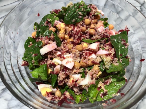 Comment consommez-vous les betteraves ? Crues et râpées, ou cuites et découpées en cubes ? Pour sortir des sentiers battus, je vous propose de les essayer cuites mais râpées, mêlées à d’autres ingrédients. Cette méthode permet aux plus difficiles de les manger sans s’en rendre compte et donc sans rechigner ! Les autres ingrédients de cette salade sont du quinoa, des pois chiches, des œufs durs, du persil, et des pousses d’épinards que j’avais sous la main. C’est donc un repas très simple, complet et végétarien que je vous propose ici.