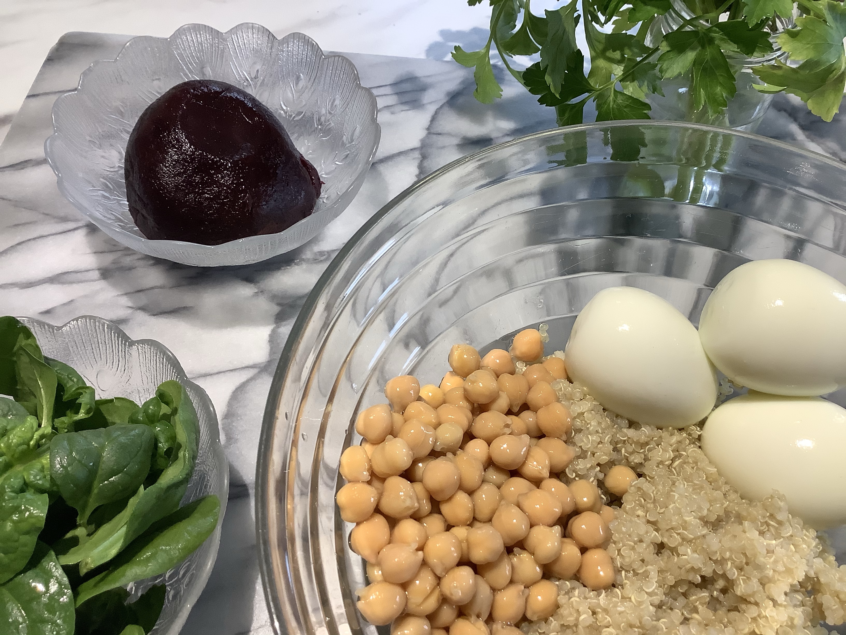 3. Mélanger le quinoa, les œufs écalés et coupés, 130g de pois chiches, du persil, et des pousses d’épinards.