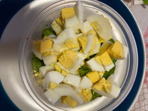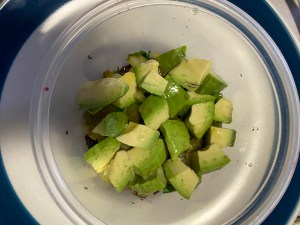 Râper la betterave (grosse râpe), l’arroser généreusement de vinaigrette. Déposer du persil par-dessus, puis le(s) cornichon(s) en petits dés, puis le demi-avocat en morceaux, que l’on arrose de vinaigre pris du bocal à cornichons, pour éviter son oxydation. Compléter par un peu de salade hachée et de l’œuf dur coupé en morceaux.