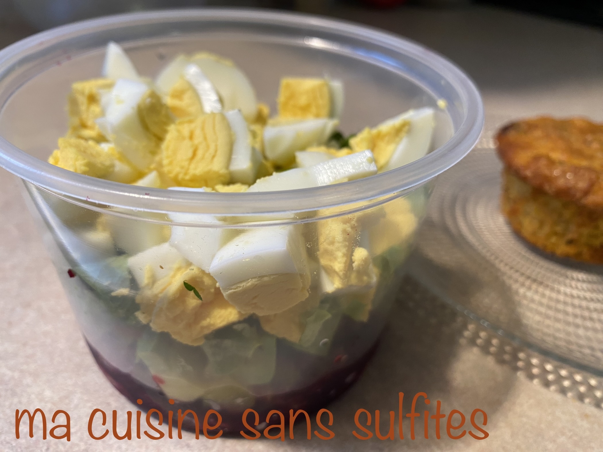 Comme le titre l’indique, je prépare cette salade pour ma pause au travail. Je superpose les couches dans un contenant hermétique et c’est au moment de manger mon repas que je mélange les ingrédients. C’est facile, et on peut même préparer ce pique-nique la veille au soir. L’été, remplacer la betterave par de la carotte râpée et le cornichon par du concombre. Pour un mini-repas plus complet, on peut lui ajouter du riz ou bien un petit dessert comme sur la photo. Ici j’ai choisi un muffin sans gluten aux carottes, recette à suivre prochainement. Côté sulfites, les cornichons préparés dans du vinaigre blanc (pas de vinaigre de vin) n’en contiennent pas et ne posent pas de problème.