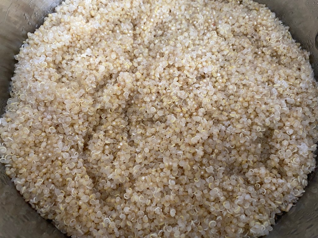 Quand on manque de temps, la solution de facilité est d’acheter du quinoa tout prêt. Pratique, mais au bout du compte plus cher, et avec un emballage probablement en plastique qu’il faudra jeter ou recycler si possible. Si on opte pour une cuisson maison, il faut prévoir de le rincer abondamment pour éliminer son amertume. On gaspillera moins d’eau en le préparant grande quantité. Le surplus peut alors être congelé en portions. D’ailleurs, je trouve que le quinoa a meilleur goût si on le laisse refroidir avant de l’employer; il en va de même s’il est décongelé.
