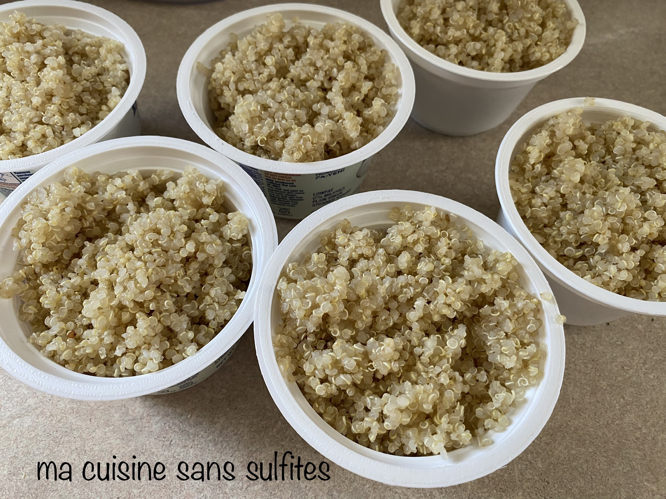 2. Mettre dans une casserole avec 250 ml d’eau ou de bouillon, qu’on peut saler si l’on veut. Porter à bonne ébullition, puis baisser le feu et couvrir. Cuire 15 minutes, éteindre et laisser gonfler en gardant le couvercle. L’idéal est de laisser refroidir complètement avant son utilisation. Comme j’essaie d’avoir toujours un temps d’avance sur mes repas, c’est parfait: je prépare le quinoa en grande quantité (200g minimum) au moins la veille, selon ma disponibilité et je le sors du réfrigérateur ou du congélateur à ma convenance.