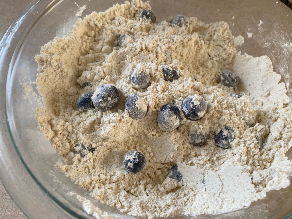1. Peser et mélanger tous les ingrédients secs dans un saladier. Se servir d’un fouet à main pour homogénéiser le mélange. Ajouter les myrtilles et mélanger de nouveau.