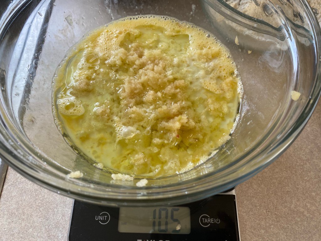4. Déposer le saladier sur la balance de cuisine. Eplucher la pomme et en râper (petite râpe) de 90 à 110g directement dans le mélange humide afin d’empêcher l’oxydation.