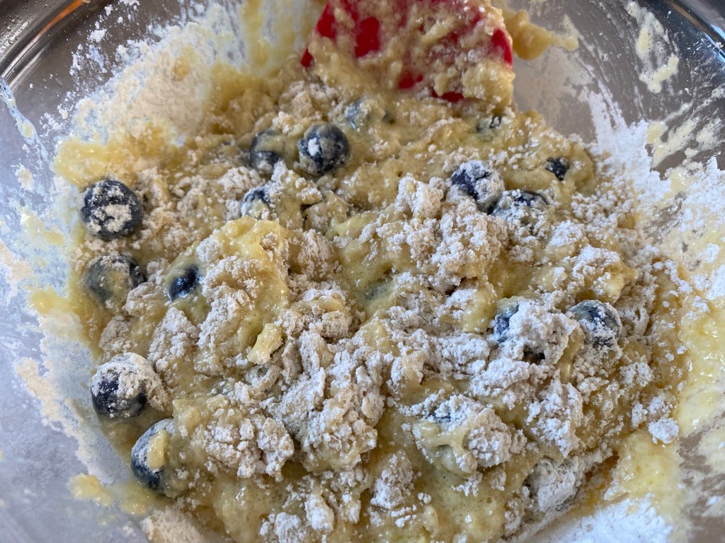 5. Incorporer rapidement le mélange farines + myrtilles dans le liquide. Ne pas sur-mélanger et ignorer les grumeaux. Il suffit que la farine soit humidifiée pour réussir cette recette.