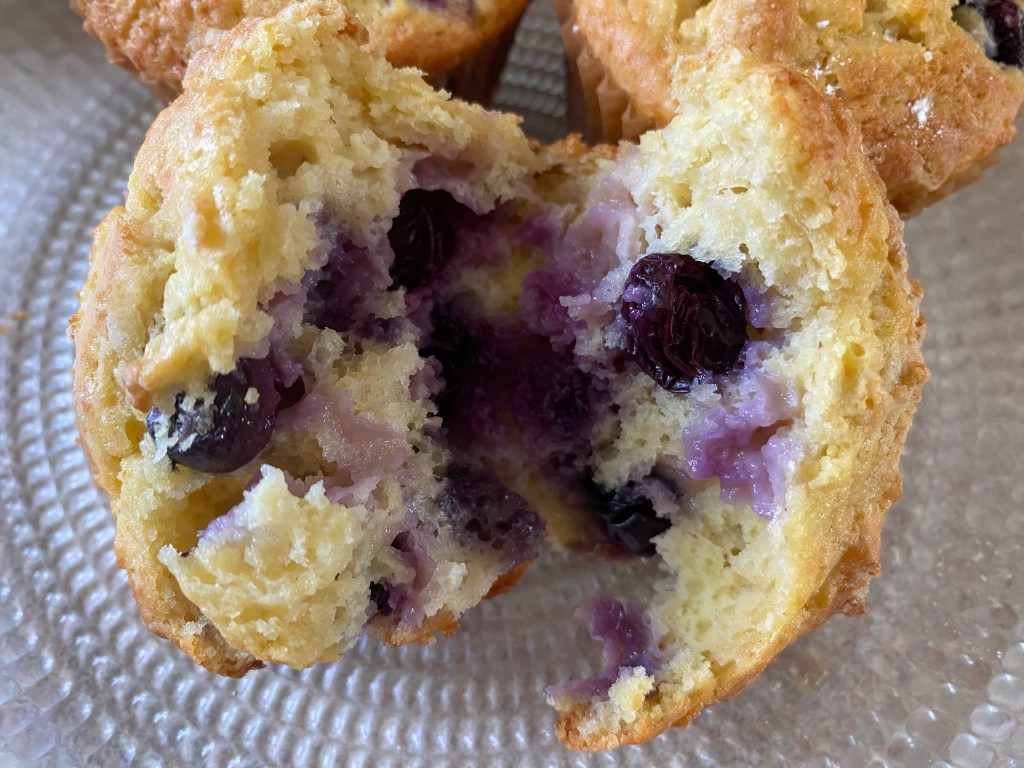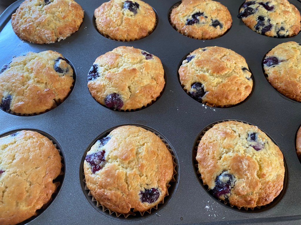 Les myrtilles sont un fruit d’été mais cette recette peut être réalisée avec des myrtilles surgelées (aucune décongélation nécessaire). Ces muffins ne sont pas très sucrés, par choix personnel d’abord, et aussi parce qu’ils contiennent de la pomme râpée pour leur apporter du moelleux. Si vous les réalisez avec des myrtilles sauvages, il faudra peut-être ajuster la quantité de sucre. Mon choix de farines est le même que pour les muffins aux carottes et noix de pécan. Au fil des ans, j’ai réduit le nombre de paquets qui sont dans mon placard, et j’ai appris à apprécier la farine de pois chiche, et à l’employer à la place de la farine de châtaigne. Son goût est plus neutre et surtout son prix bien plus abordable, en particulier aux Etats-Unis où, depuis que les châtaigniers ont été décimés par une maladie dans la première moitié du siècle précédent, cette farine est actuellement importée d’Europe.