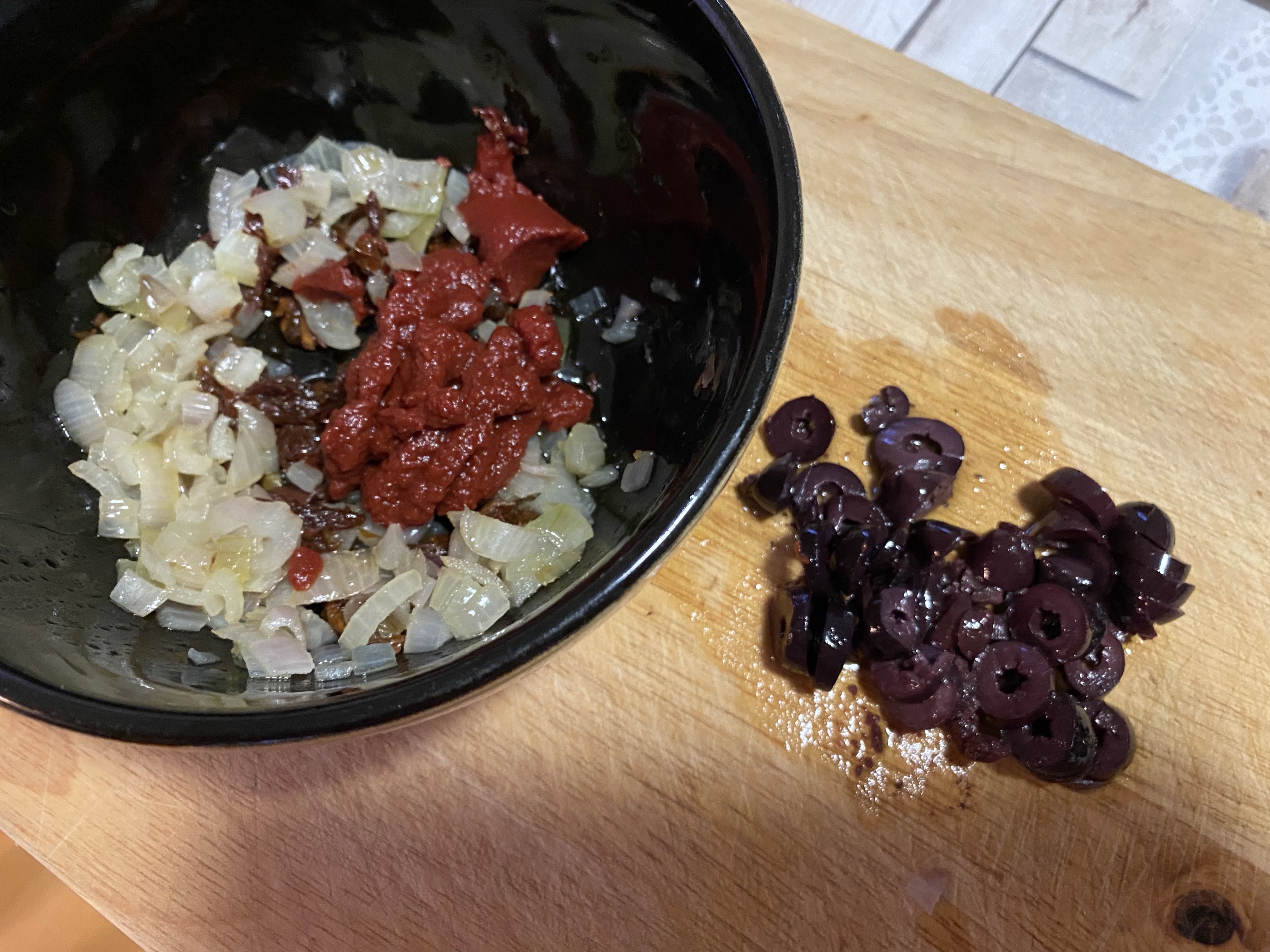 – Pendant la cuisson des échalotes, couper 25g de tomates séchées en petits morceaux (utiliser des ciseaux de cuisine facilite cette opération) et détailler 8 olives noires en rondelles.