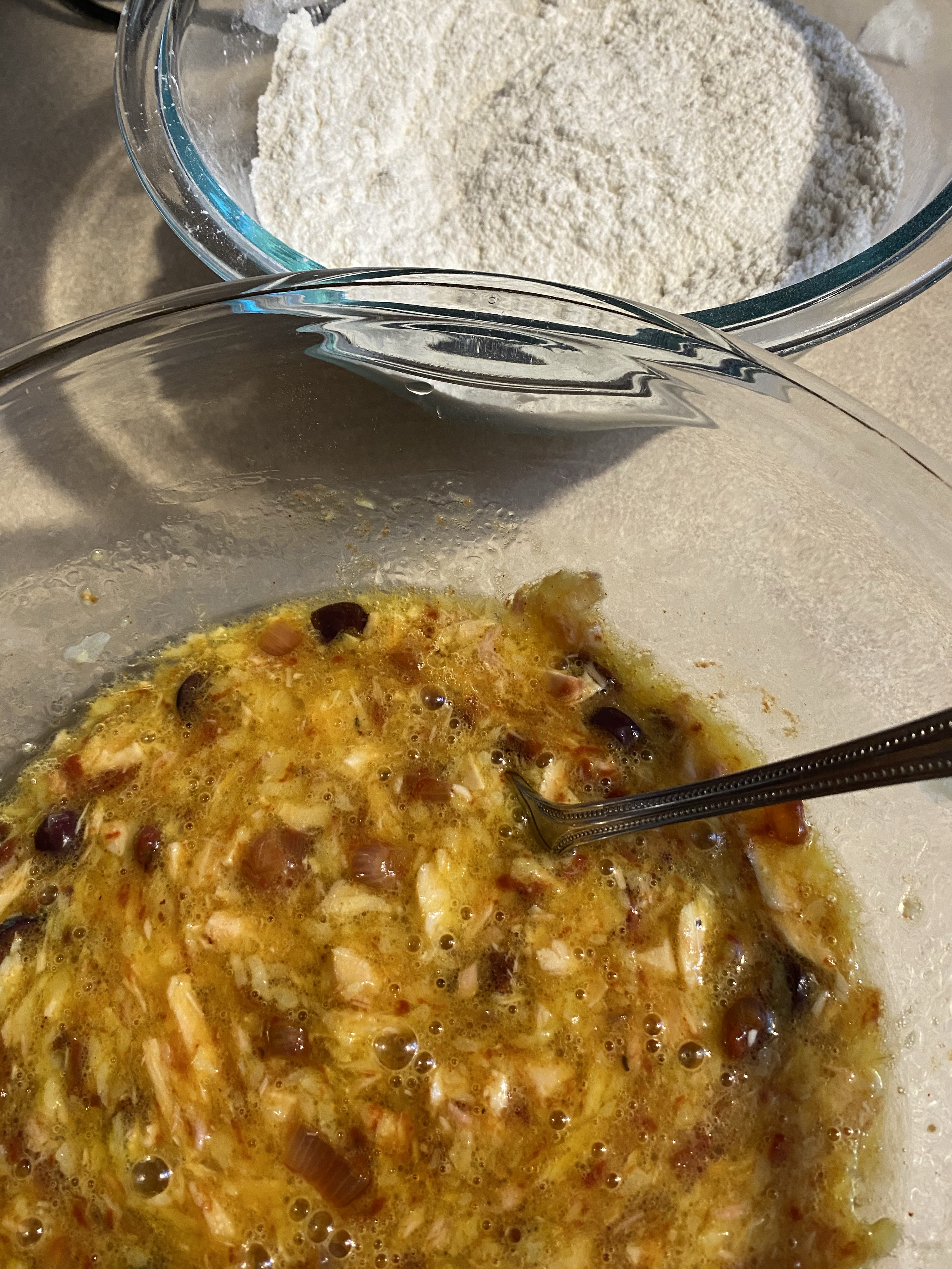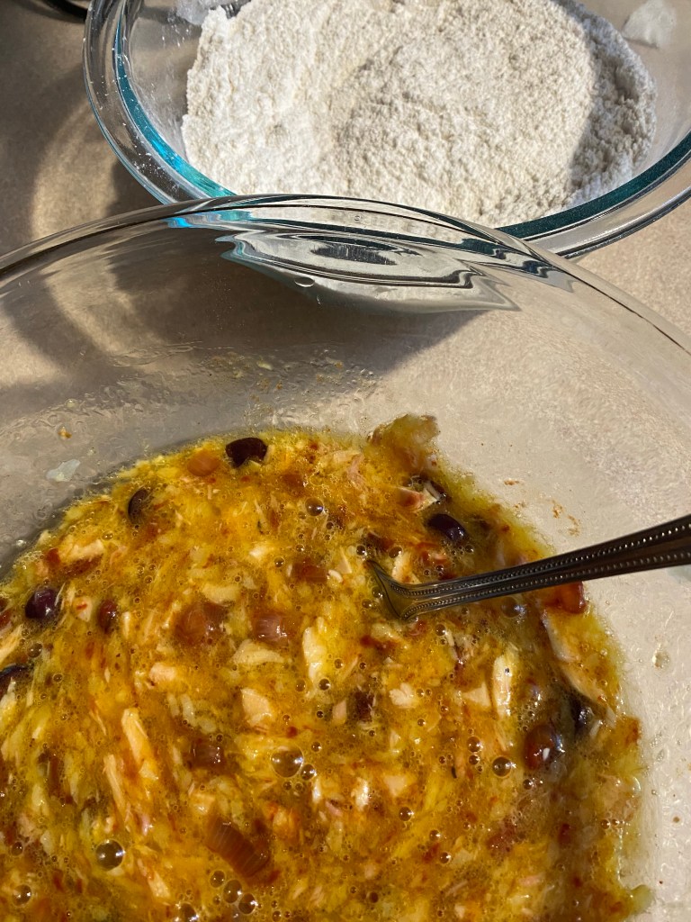 – Dans un grand saladier, battre 4 œufs avec ½ cc de sel et ¼ cc de piment de Cayenne (facultatif). C’est peu de sel mais peut-être même un peu trop si le thon en contient déjà, sans oublier que les olives et les tomates séchées vont aussi se charger de l’assaisonnement.