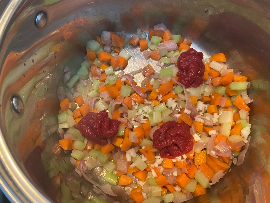 2. Ajouter l’ail émincé ainsi que 3 CS de concentré de tomate, mélanger et laisser sur le feu une minute supplémentaire.