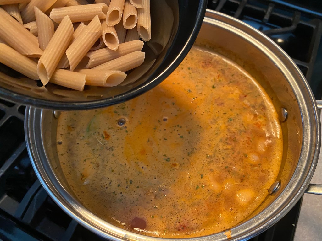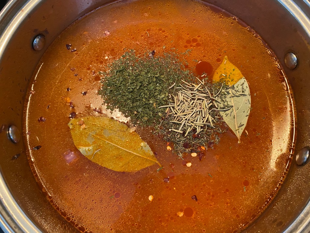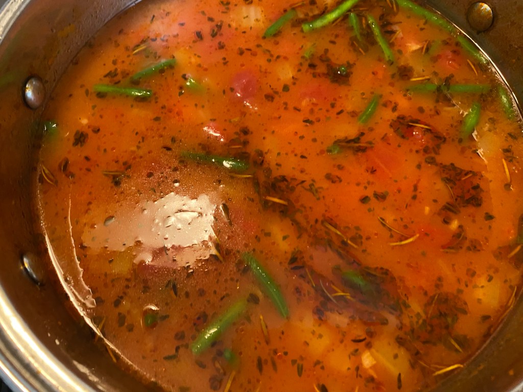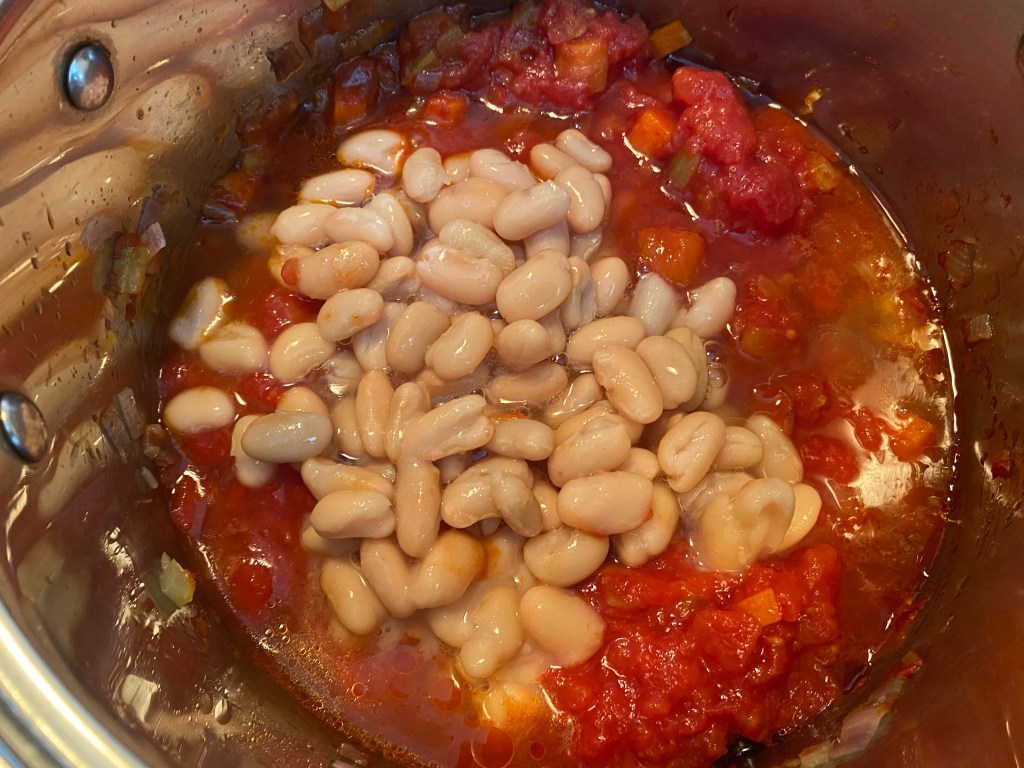 3. Mettre alors 400g de tomates concassées, 400g de haricots secs cuits avec leur jus, 1,5 litre de bouillon, ½ cc chacune de thym, romarin, persil déshydraté, 2 feuilles de laurier et un peu de piment si l’on veut. Mener à ébullition avant d’ajouter 75g de pâtes. Baisser le feu à reprise de l’ébullition et laisser cuire à couvert et à feu doux pendant 45 minutes.