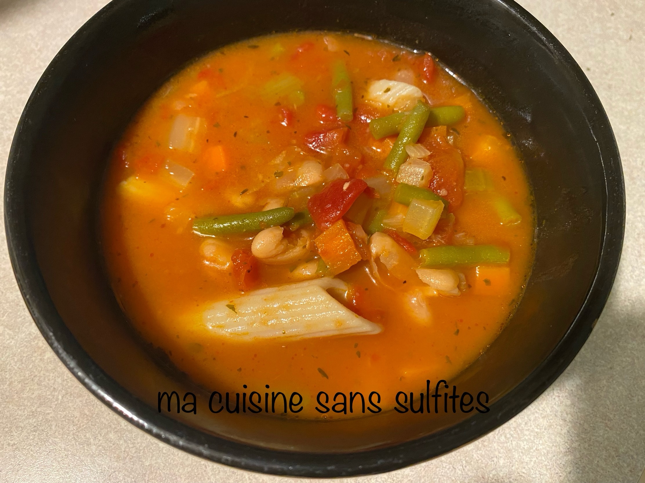 Faire une soupe à base de légumes d’été en hiver est tout à fait posssible. Les haricots verts, et même les tomates, sont à disposition toute l’année, grâce au congélateur. Les tomates en conserve sont également sans risque pour les intolérants aux sulfites à condition qu’ aucun additif n’apparaisse dans la liste des ingrédients . Mis à part le poireau et le parmesan, que je n’inclus pas dans ma recette, cette minestrone est très classique. Quand je la sers, j’aime lui ajouter du pesto vegan maison au moment de servir (Et je m’aperçois à l’instant que je n’en ai jamais publié la recette ! Je vais devoir rectifier cet oubli…), pesto que je fais en grande quantité l’été quand le basilic est frais, et que je congèle en portions.