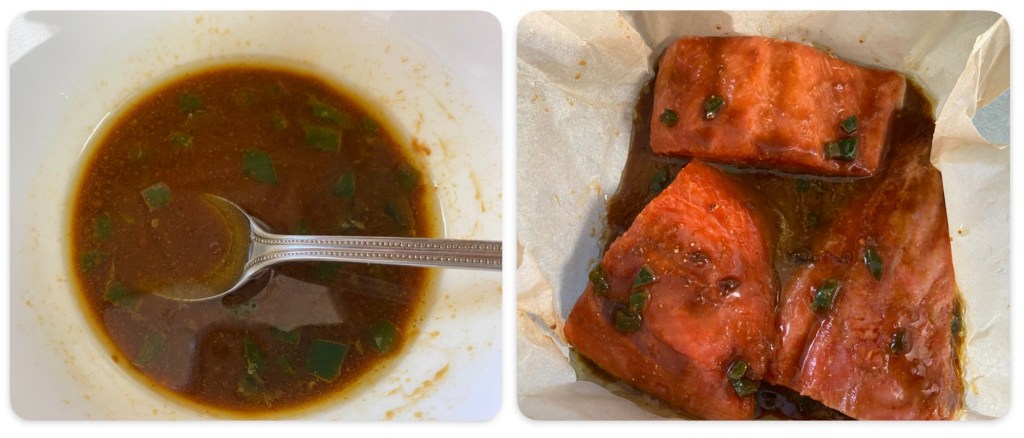 Ingrédients pour 3 morceaux de saumon: – 2 cc de miso « rouge« – 2 CS de jus de citron vert – 2 CS de tamari – 2 CS d’huile d’olive – un petit piment vert(facultatif), coupé en petits tronçons. Les plus sensibles enlèveront les graines à l’intérieur. Attention à enfiler des gants ou bien à se laver les mains à l’eau savoneuse + du bicarbonate alimentaire après l’avoir manipulé!