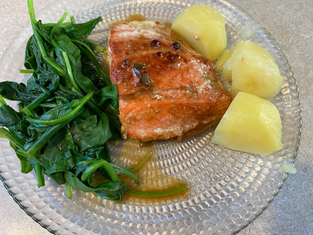J’arrose le saumon de la marinade plusieurs fois pendant le temps de la marinade.Avec légumes et féculents.