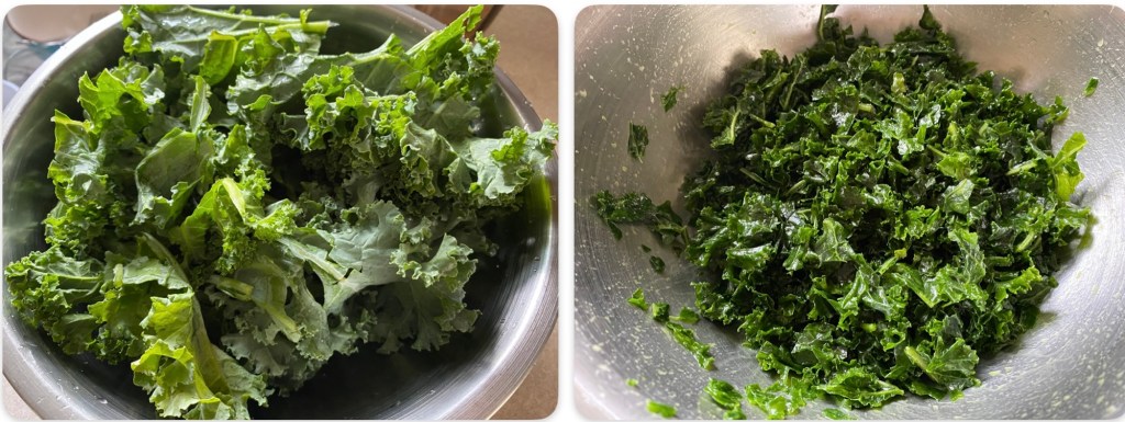 1. Ôter les tiges du chou kale et couper ce qui reste en lanières. Les déposer dans un saladier.