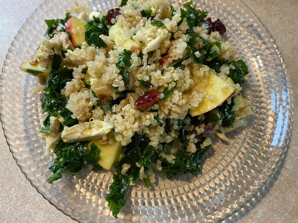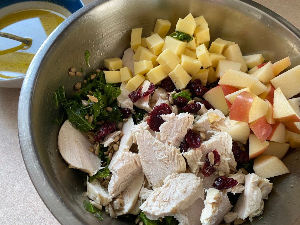 4. Au chou, ajouter le poulet en morceaux, les 90g de fromage en petits cubes, la pomme en tranches ou en morceaux, 2 CS de cranberries, le quinoa et des graines de tournesol à volonté. Arroser avec la vinaigrette et bien mélanger avant de servir.