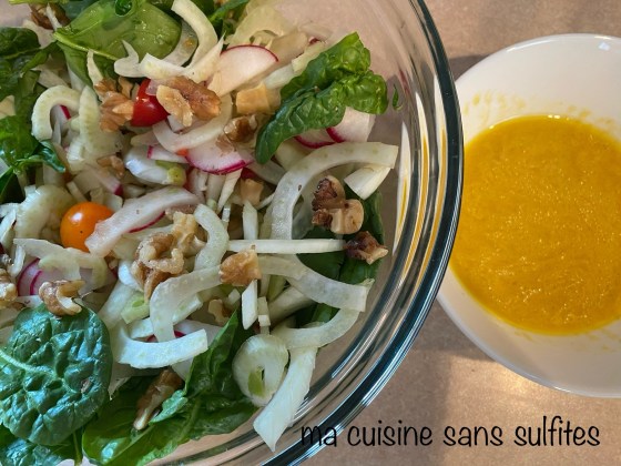 salade d’été au fenouil, pousses d’épinards, radis, tomates cerises, vinaigrette citron, moutarde et miel