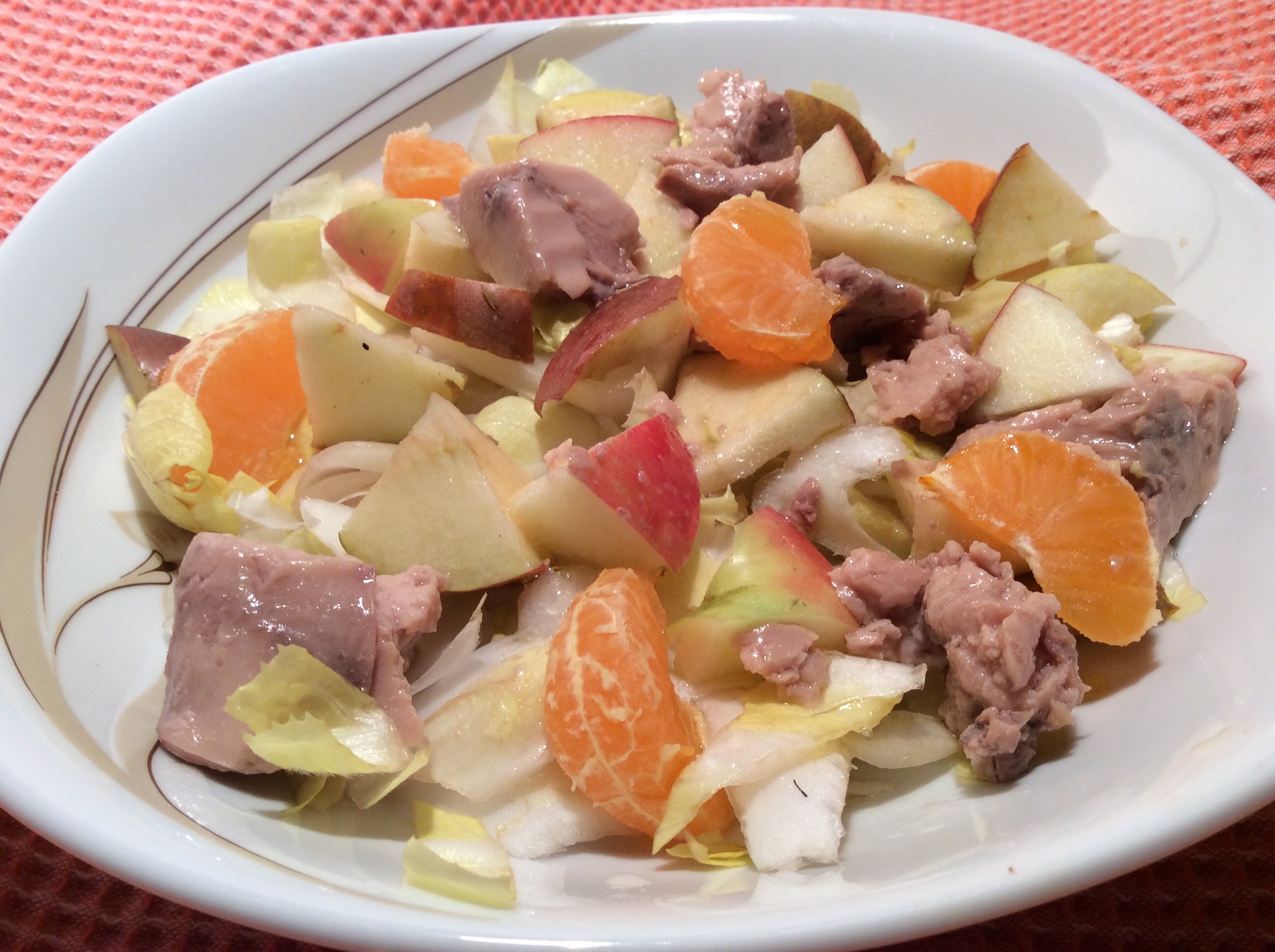 endives + pommes + mandarine + foie de morue (ou thon)-