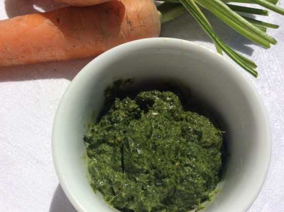 pesto aux fanes de carottes, basilic… et farine de souchet