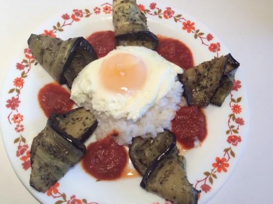 ŒUF SUR LIT DE RIZ ET AUBERGINE GRILLEE