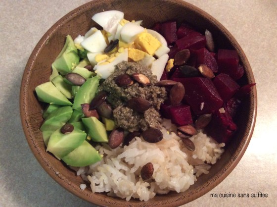 « veggie bowl » betterave, riz, avocat, œuf dur et sauce graines de courge