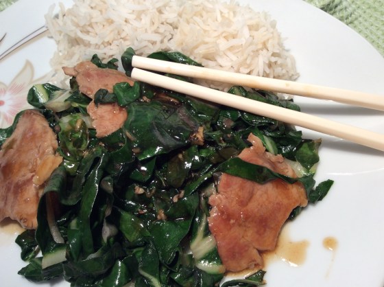sauté de porc ou dinde avec bettes / cardes / bok choy dans un plat très relevé au gingembre et curcuma