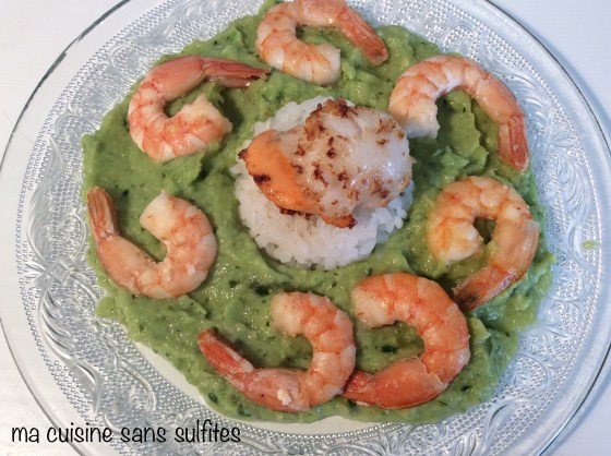 crevettes et noix de St Jacques sur lit de riz à sushi, sauce avocat, courgette et basilic