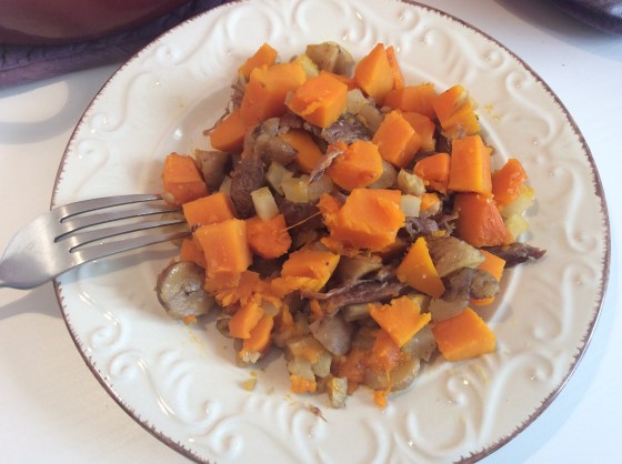 confit de canard au potimarron, navets et marrons en cocotte